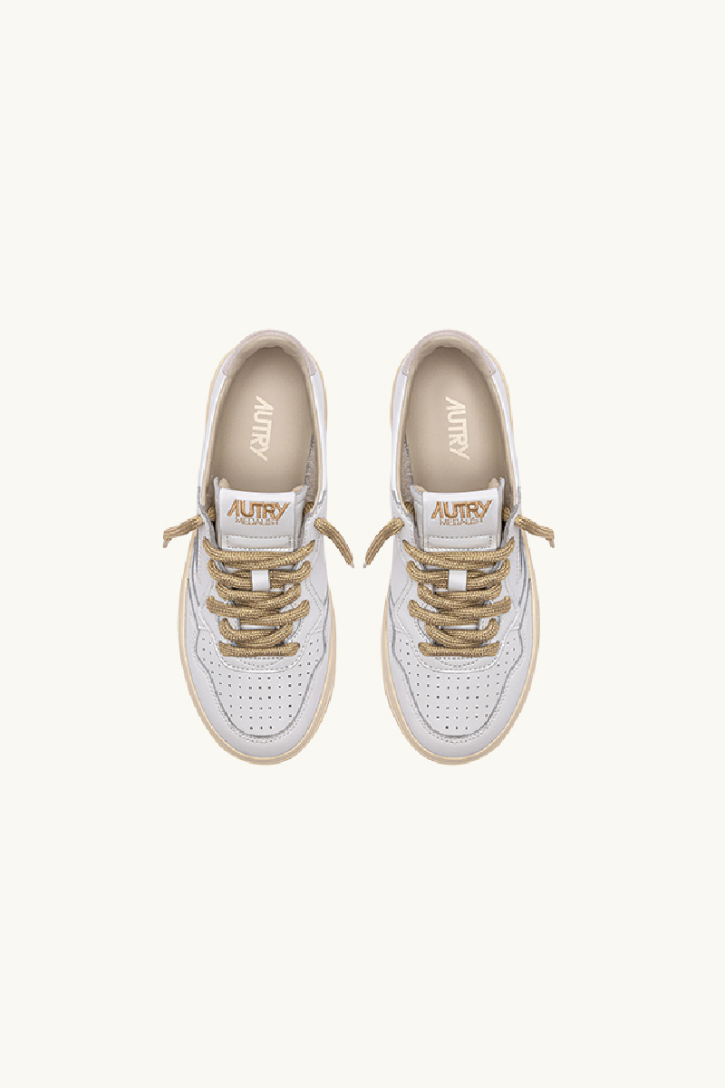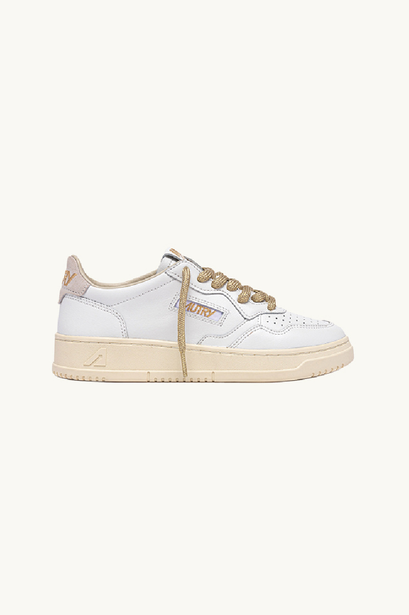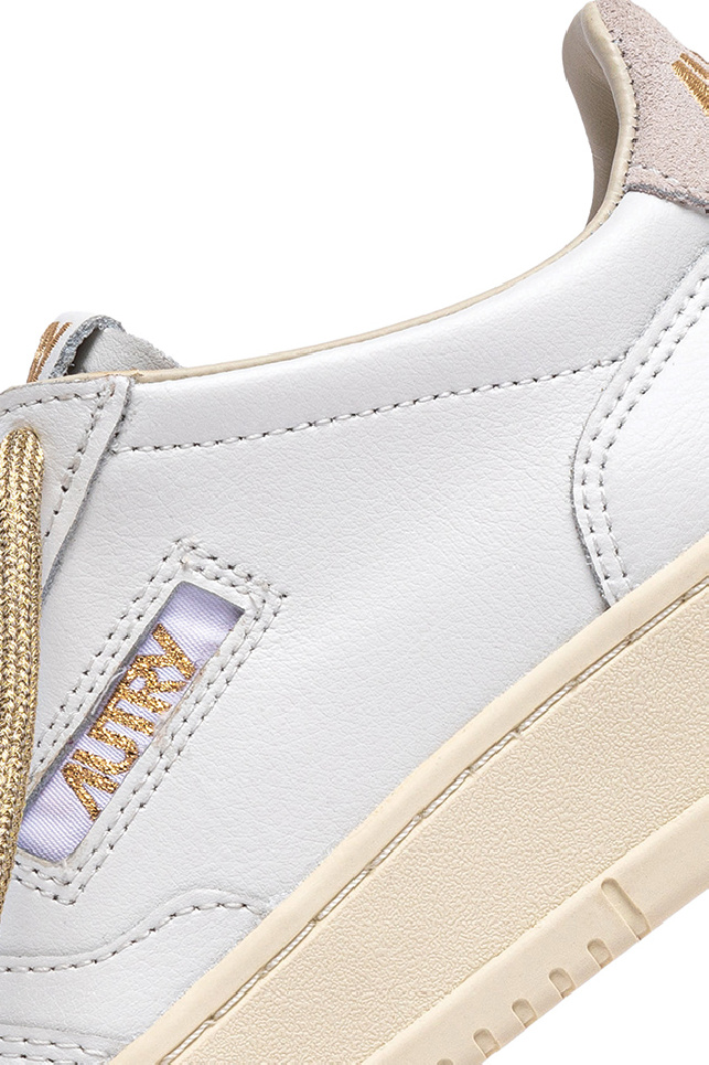 The design is finished with a beige suede heel tab highlighted by the brand’s signature logo embroidered in gold, along with the iconic Autry side logo reinterpreted in golden glitter.