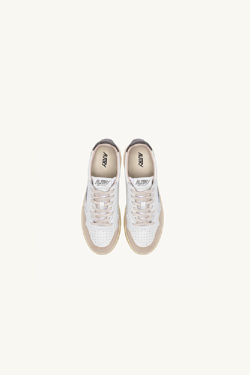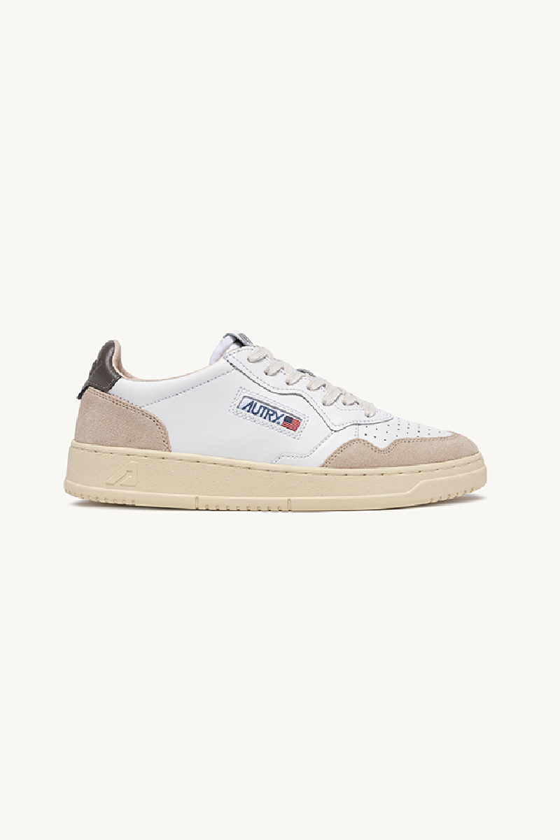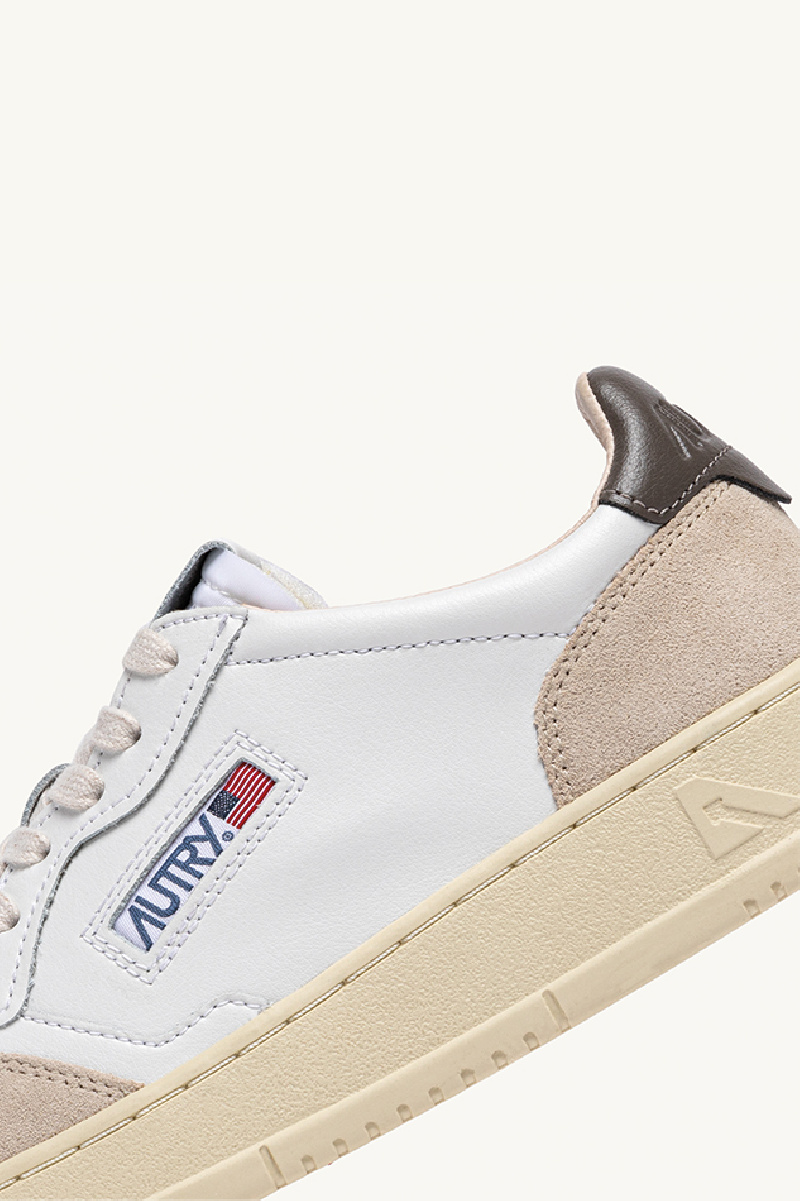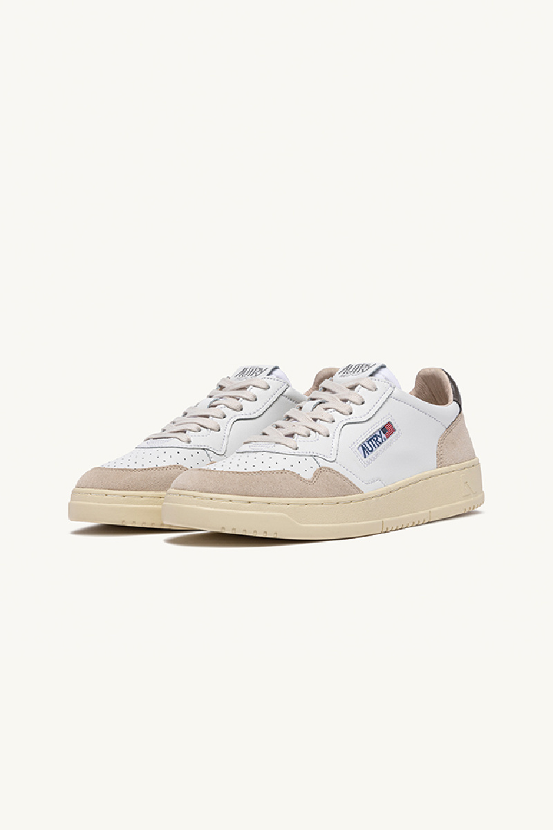Pair of AUTRY Medalist low sneakers in white leather and beige suede.