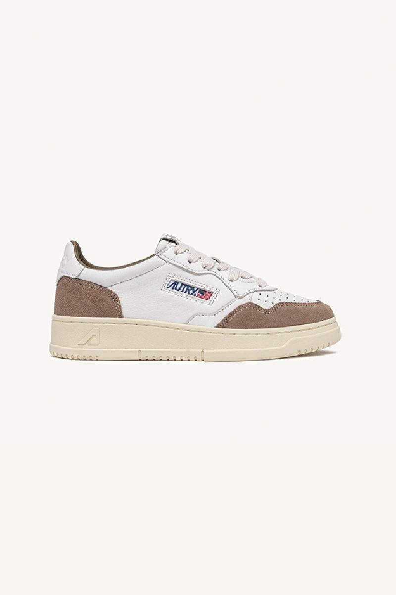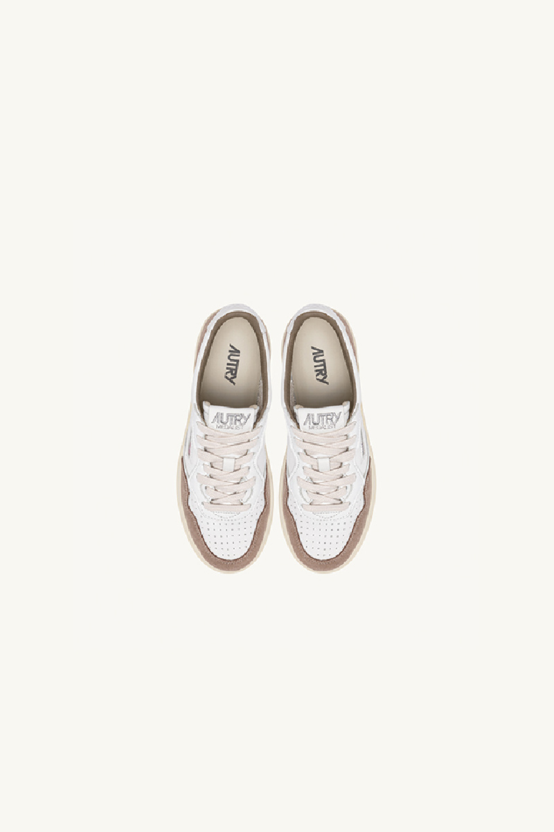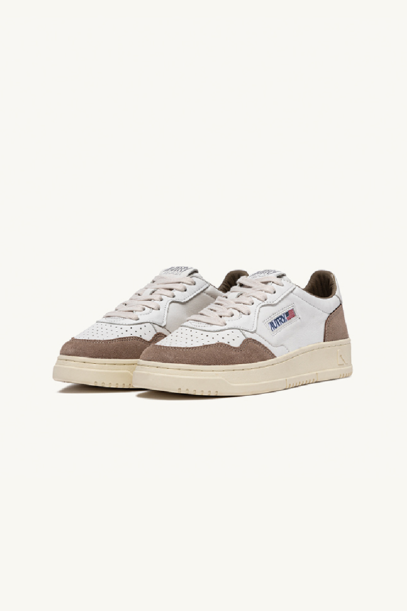 Pair of AUTRY Medalist low sneakers in white leather and tobacco suede.