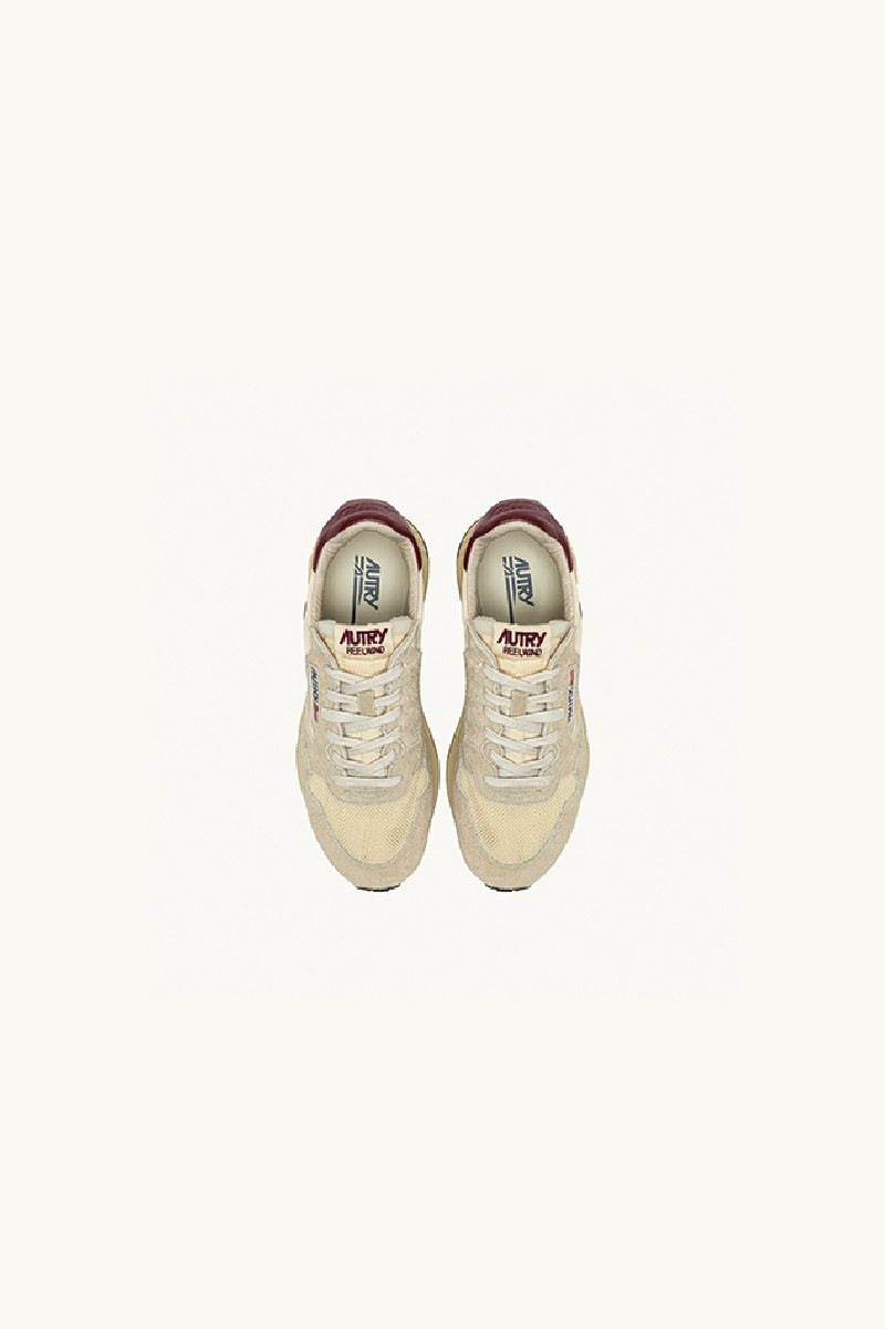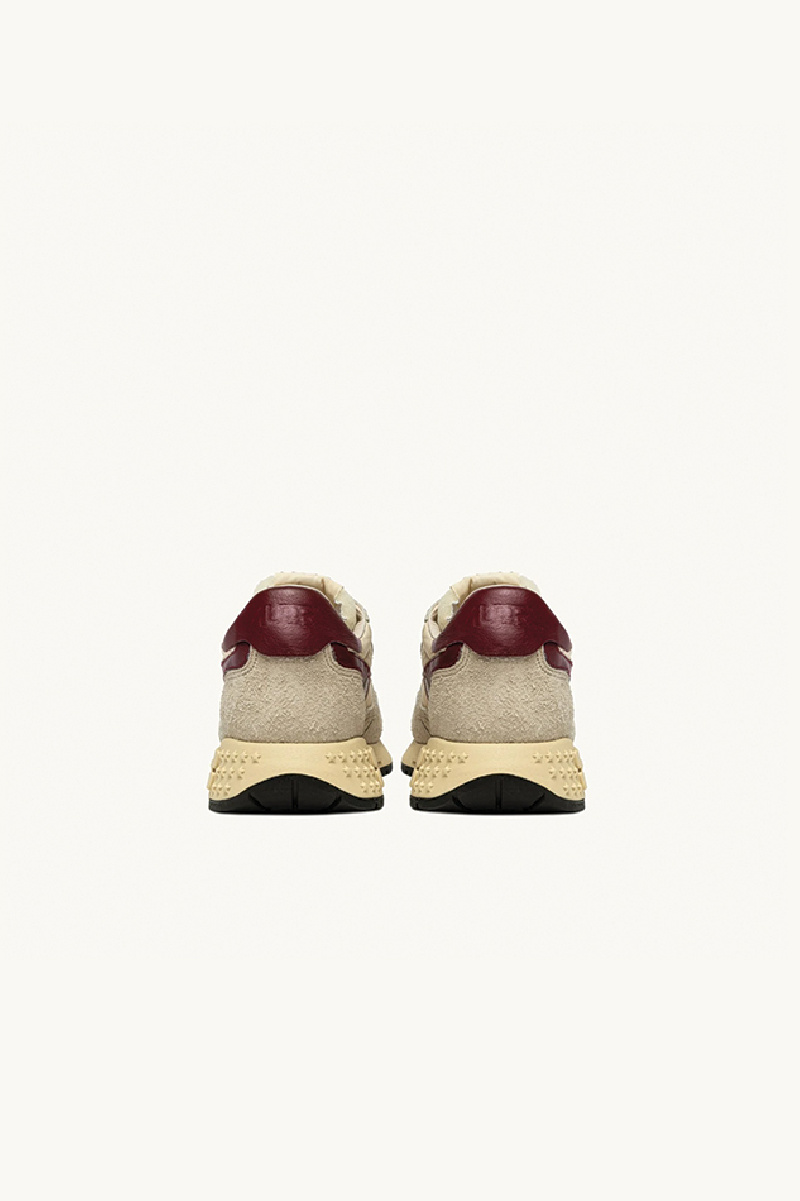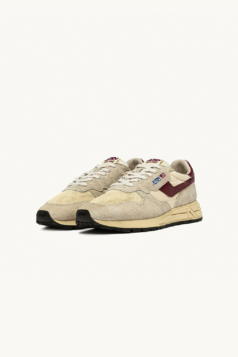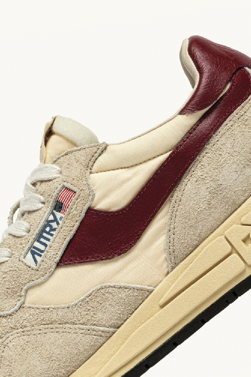 They feature wine-red leather inserts on sides and heel counter, a mesh toe box, and cotton lace-up fastening.