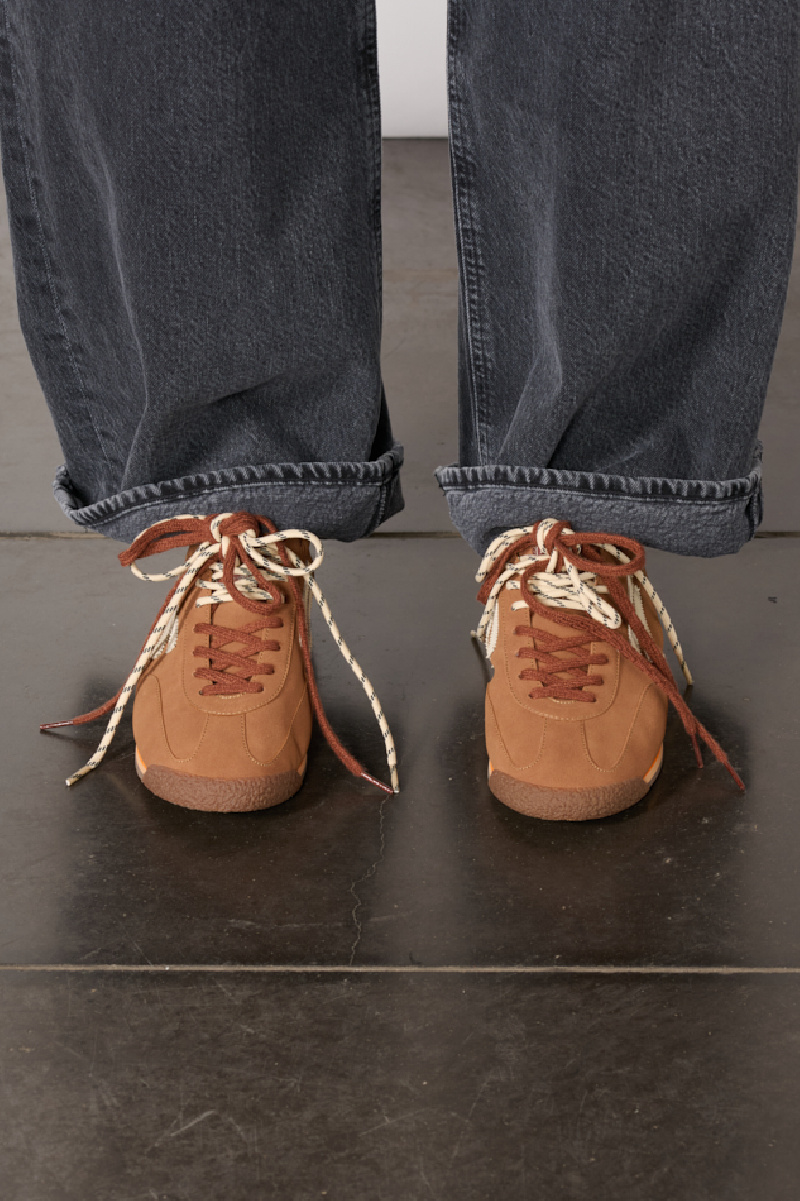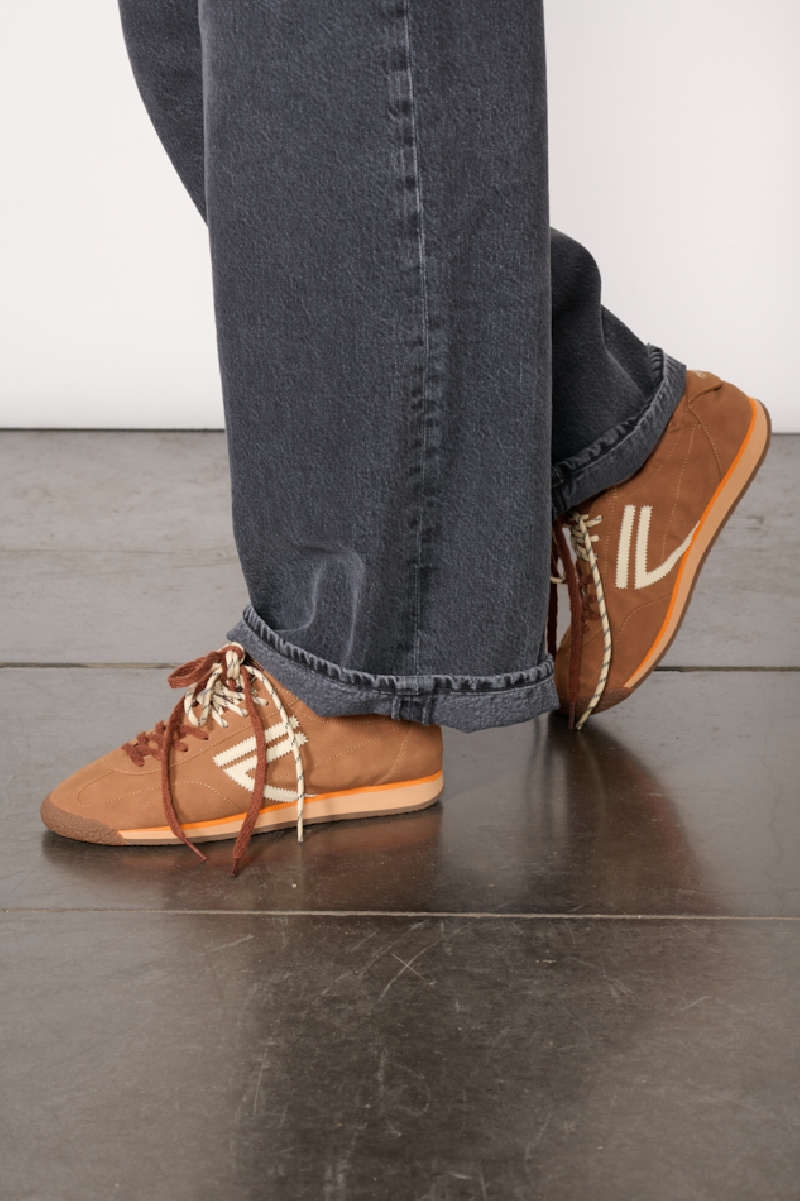 80s-inspired design, with a slim, flexible upper, tightened at the ankle, double laces in contrasting colors, and a orange, camel and brown outsole.