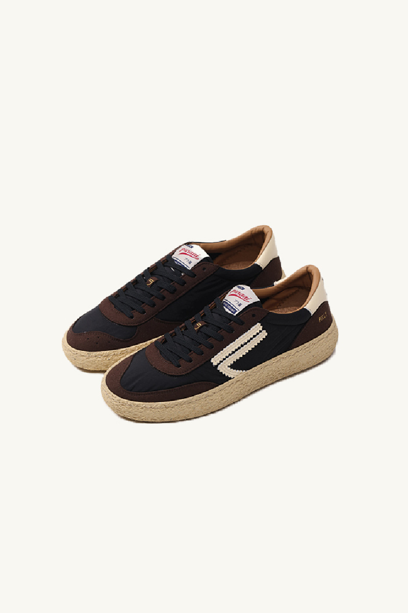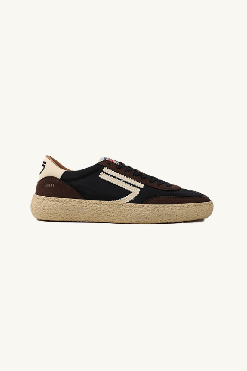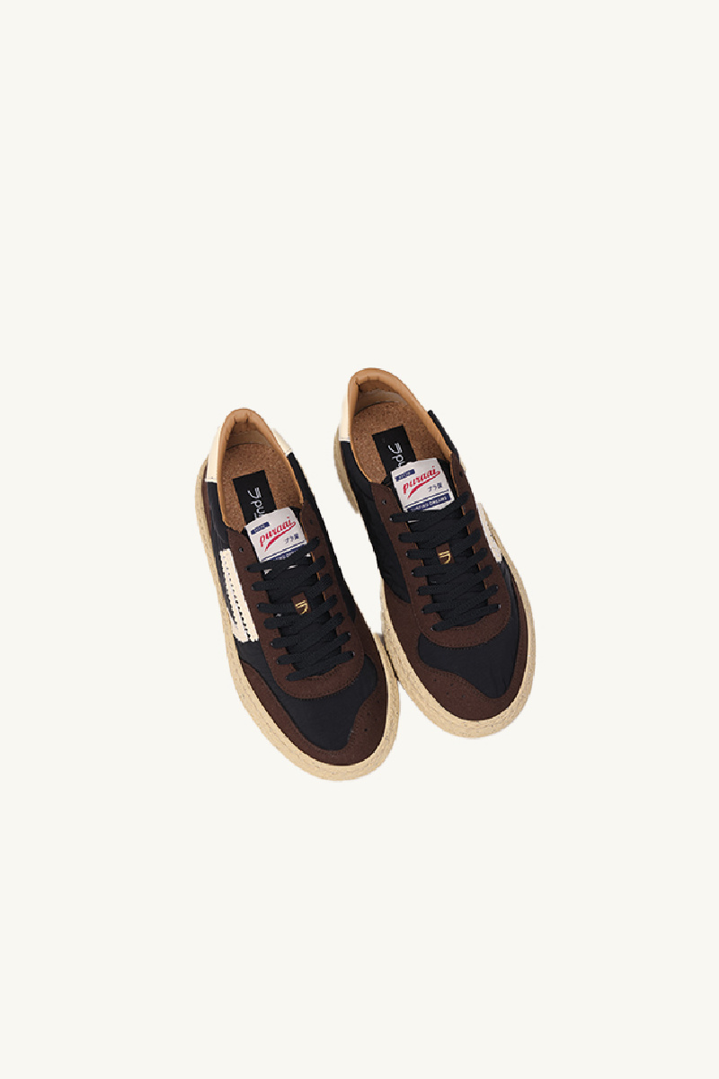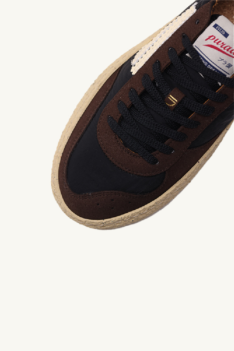 Polly trainers in Fudge colour by Puraai, designed with eco-friendly and recycled materials: black nylon and brown suede.