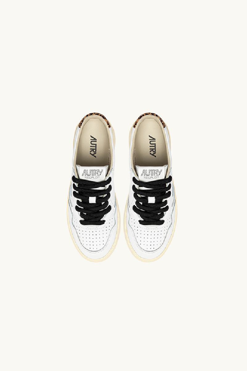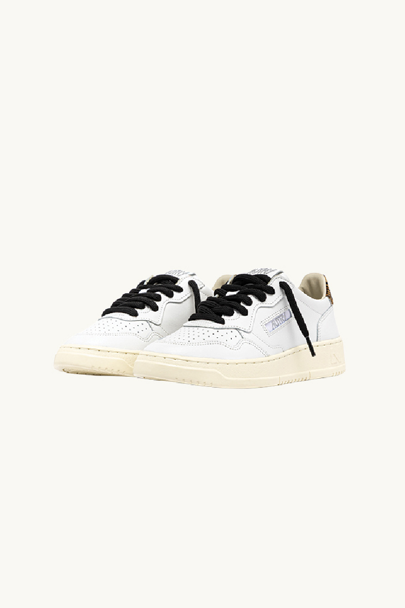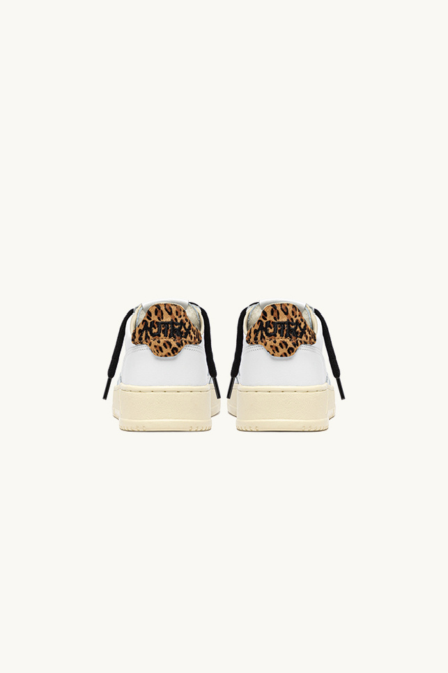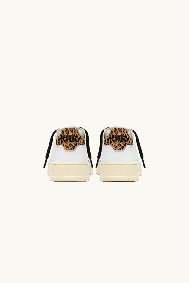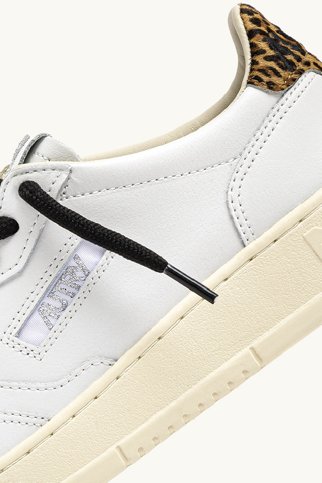 The model is completed with cotton laces delivered in two pairs (black and white), a leopard faux-fur heel tab highlighted by the brand’s iconic logo, and the small iconic Autry logo on the side of the shoe, presented in silver glitter on this model.
