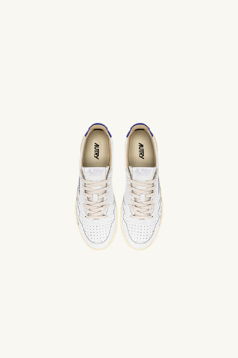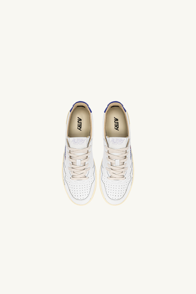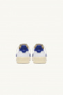 This model is distinguished by a royal blue leather heel counter highlighted by the brand's iconic logo, which echoes the lace tips in the same color.