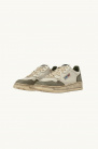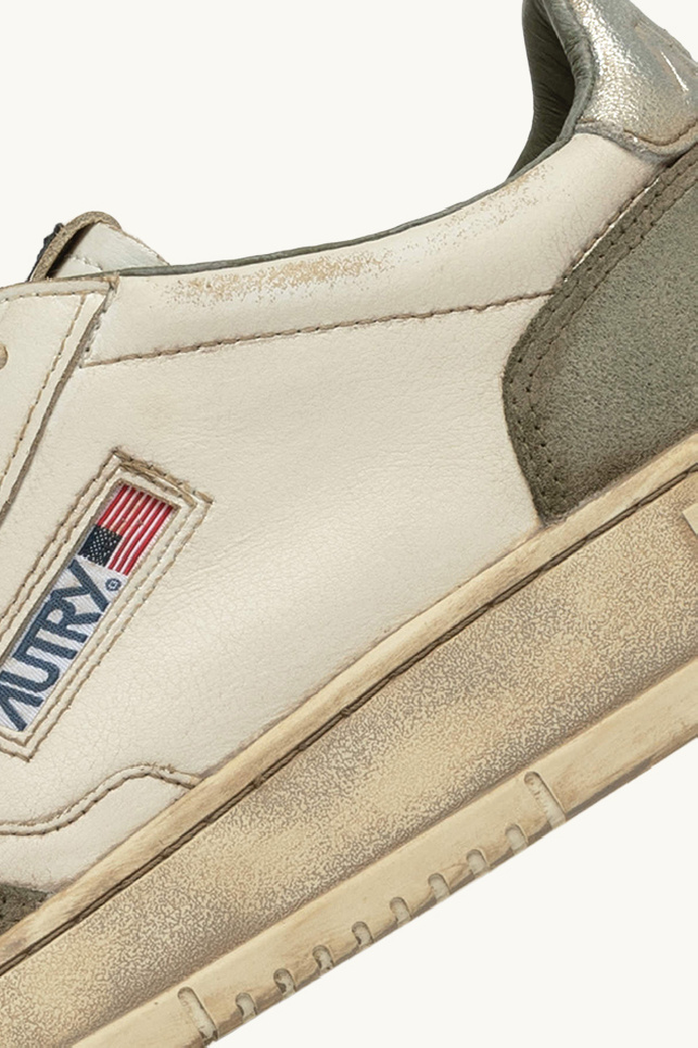 They feature a vintage-inspired design with a pronounced worn effect and military green suede panels.