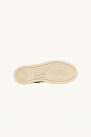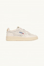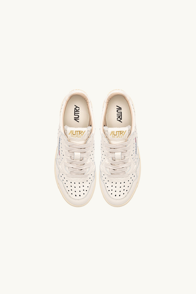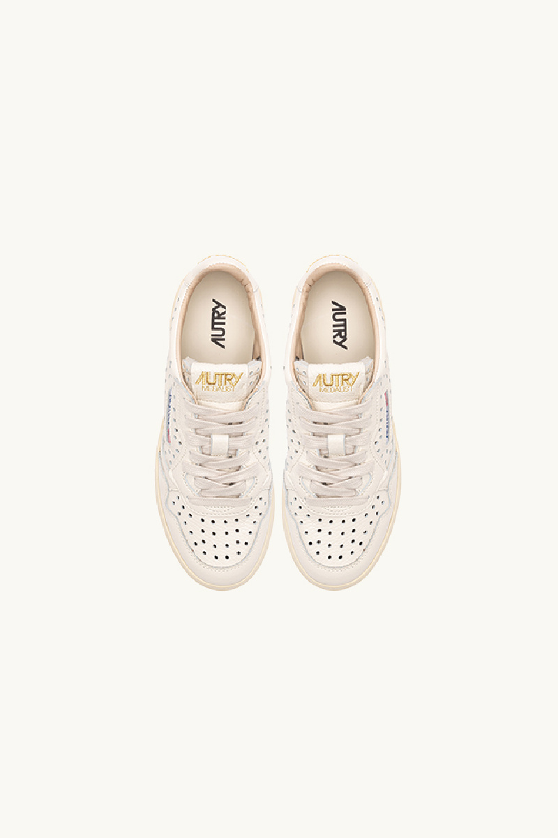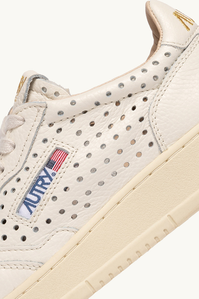 They feature a design with multiple regular perforations, a rubber sole, flat cotton laces, and a padded heel counter highlighted by the brand’s iconic gold logo.