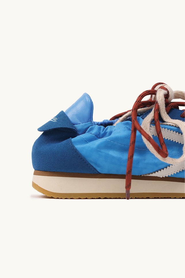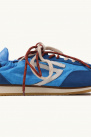 The design is completed by double lacing in contrasting colors, a rubber outsole, and a blue vegan leather heel counter.