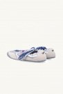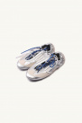 Made from vegan leather, they feature a quilted construction, an open top, a distinctive grey and blue double lacing system with removable charms, and light grey microsuede inserts.