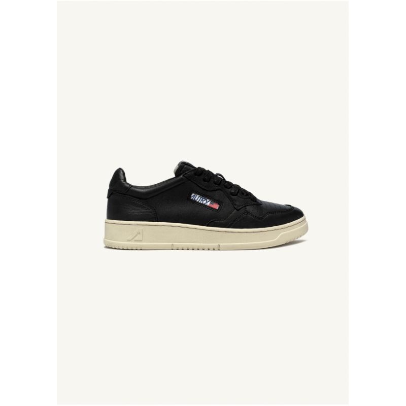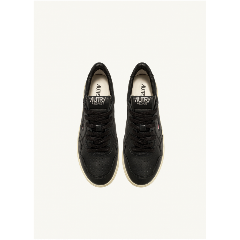 AUTRY sneaker, soft black goat leather, perforated forefoot, rubber sole, lace-up closure, fabric tongue with tag, padded counter.