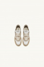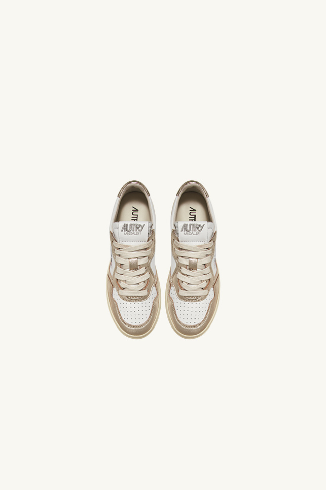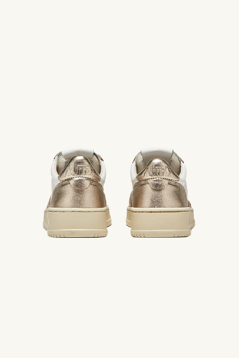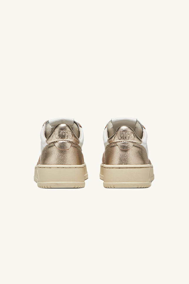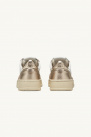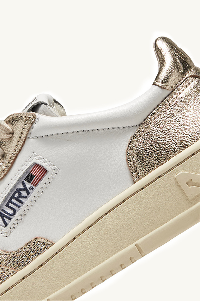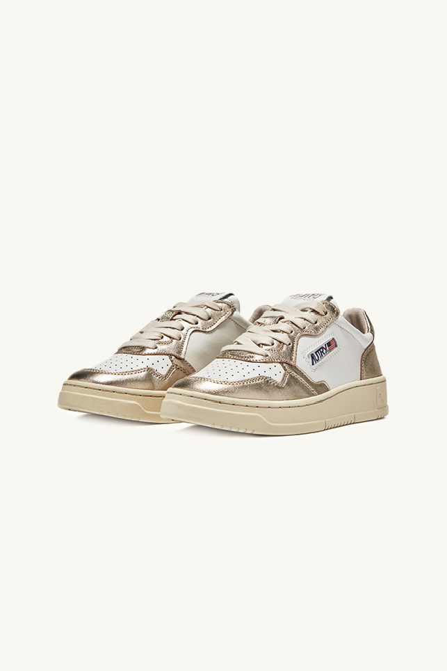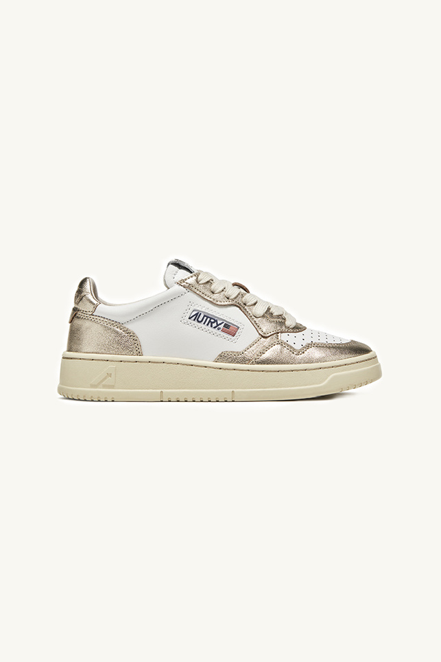 They feature platinum/gold leather overlays, a perforated toe box, and a rubber sole.