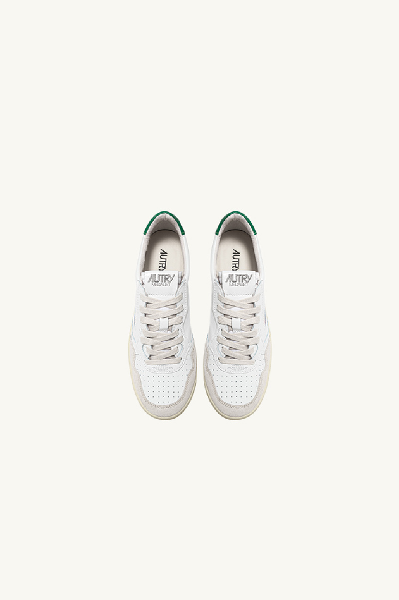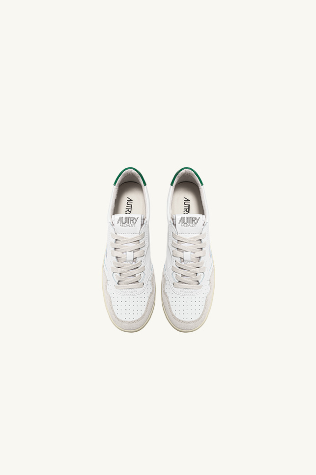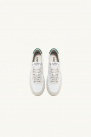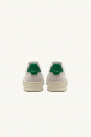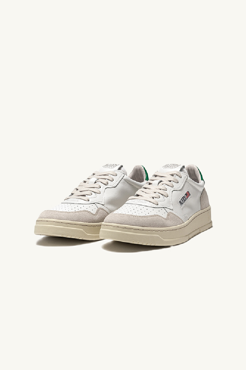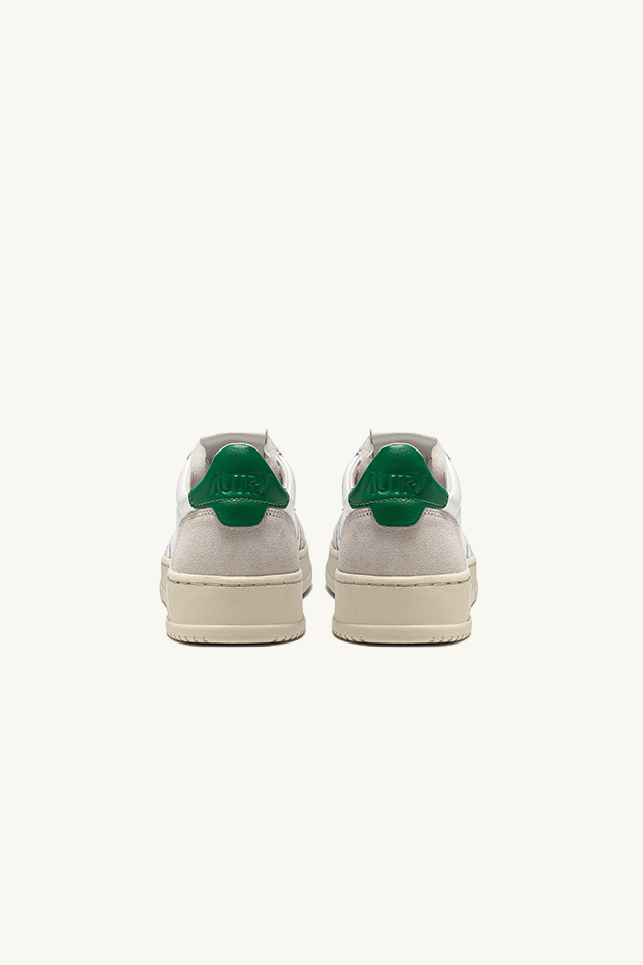 They feature beige suede overlays, a perforated toe box, a rubber sole, flat off-white cotton laces, a fabric tongue with label, and a green heel tab.