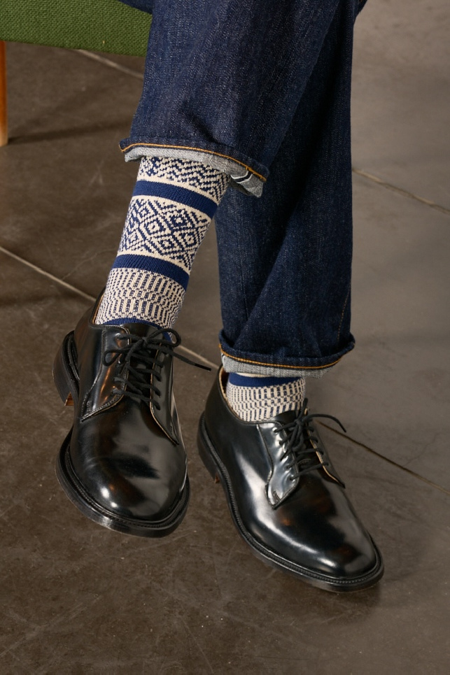 Rototo brand socks made of cotton and silk blend, navy and ivory, with different jacquard patterns.
