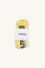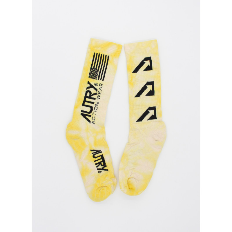 Yellow tie and dye pattern Autry socks, high rise, mixed, black logo printed "Autry Action Wear", elastic ankles, ribbed edges.