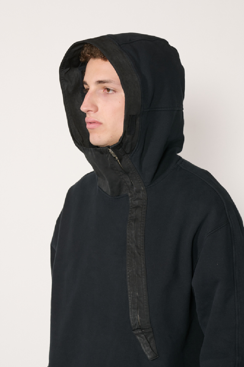 The zip fastening, slightly offset to the left, stops before the bottom hem for a deconstructed look.