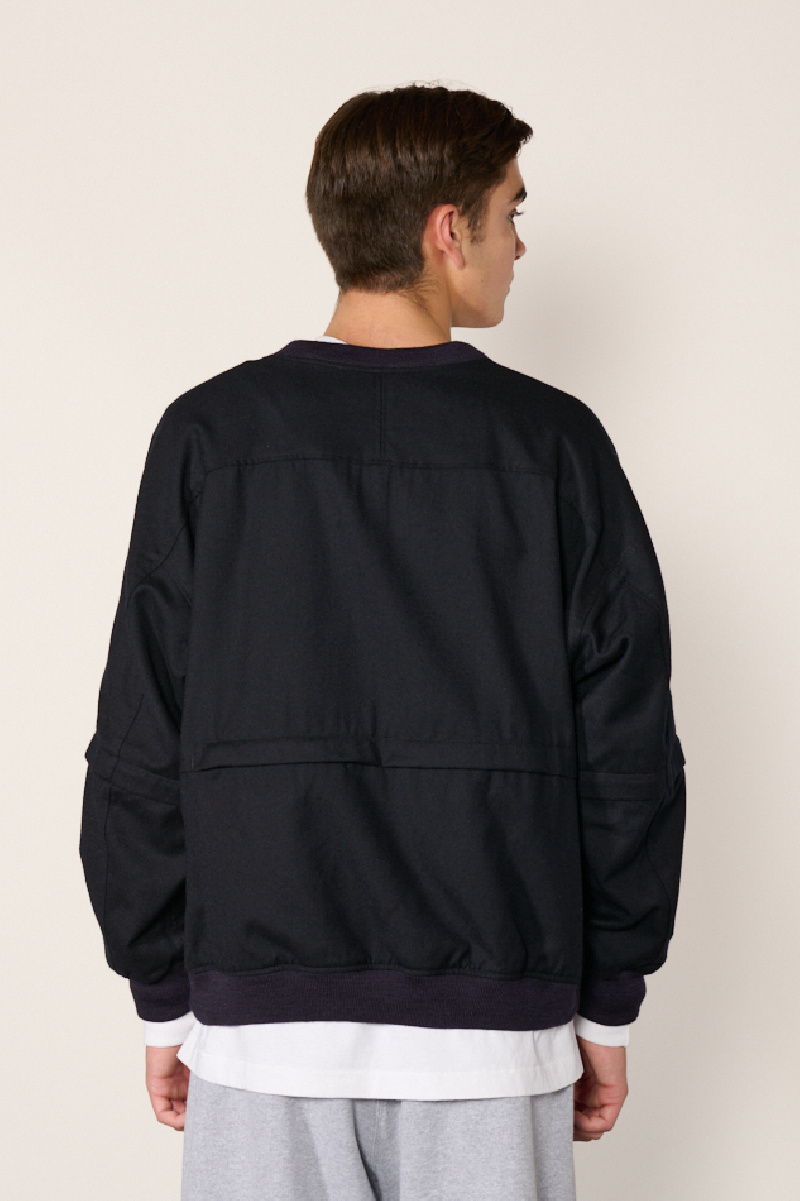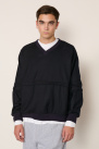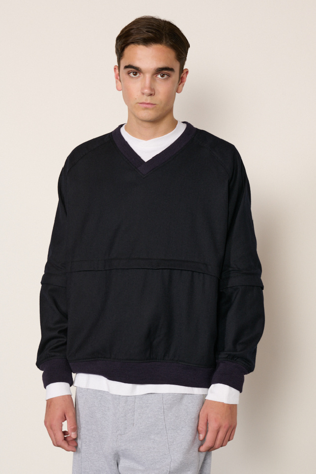 It features a loose and relaxed fit, a V-neck, zip-off sleeves, slanted front pockets, complemented by large zippered pockets discreetly integrated on the front and back of the sweatshirt.