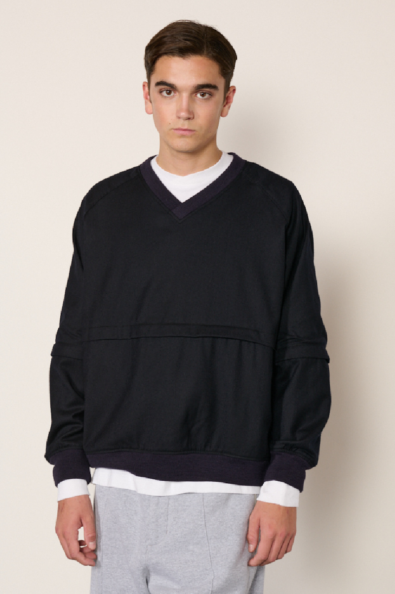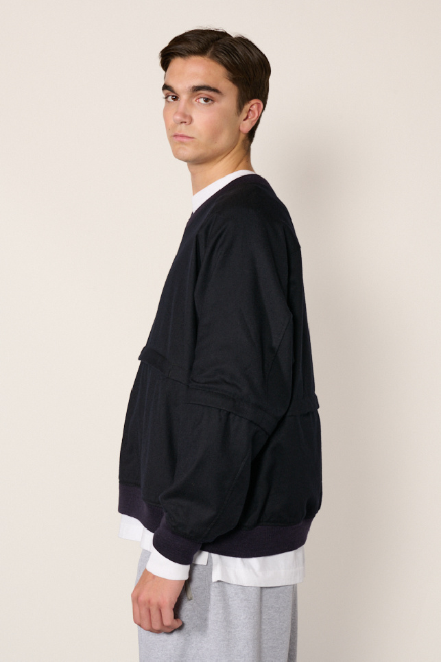 Navy worsted wool sweatshirt by the brand Engineered Garments.