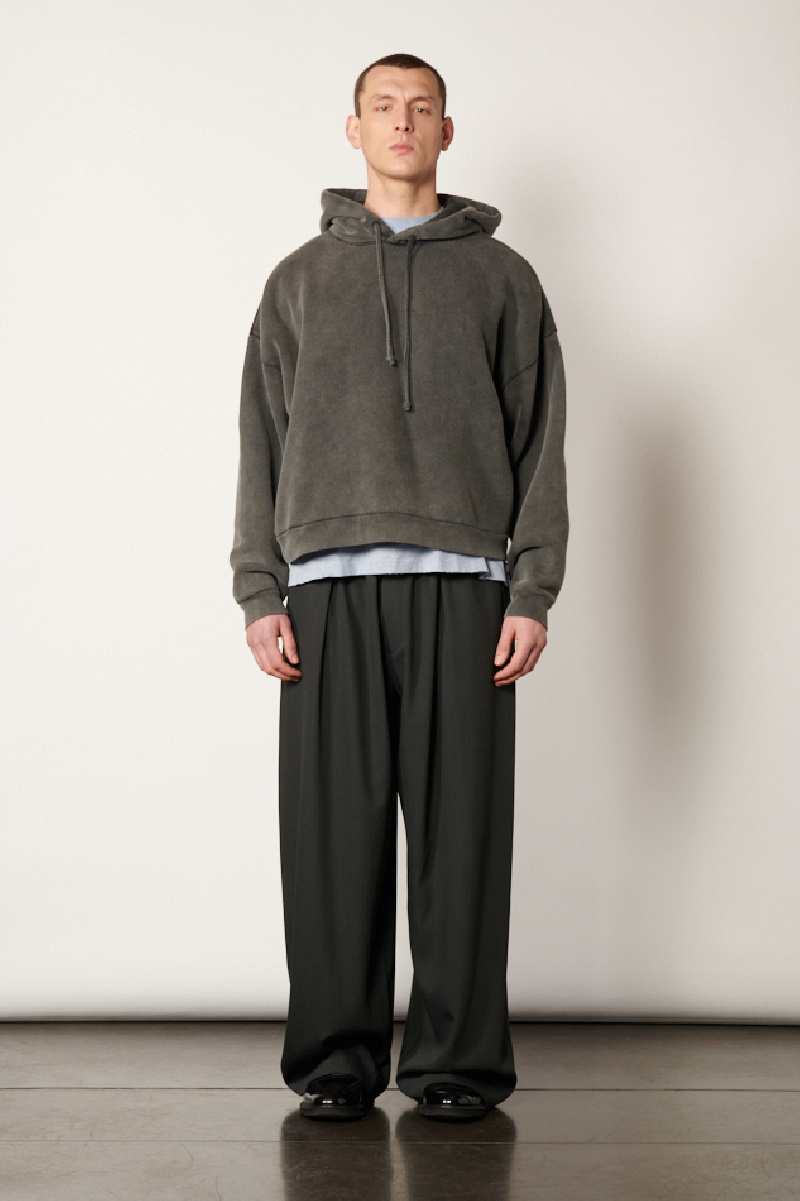 Acné Studios adjustable hoodie, Washed black, short and oversized cut, "Acné Studios" writing on transparent inserts at the center of the back.