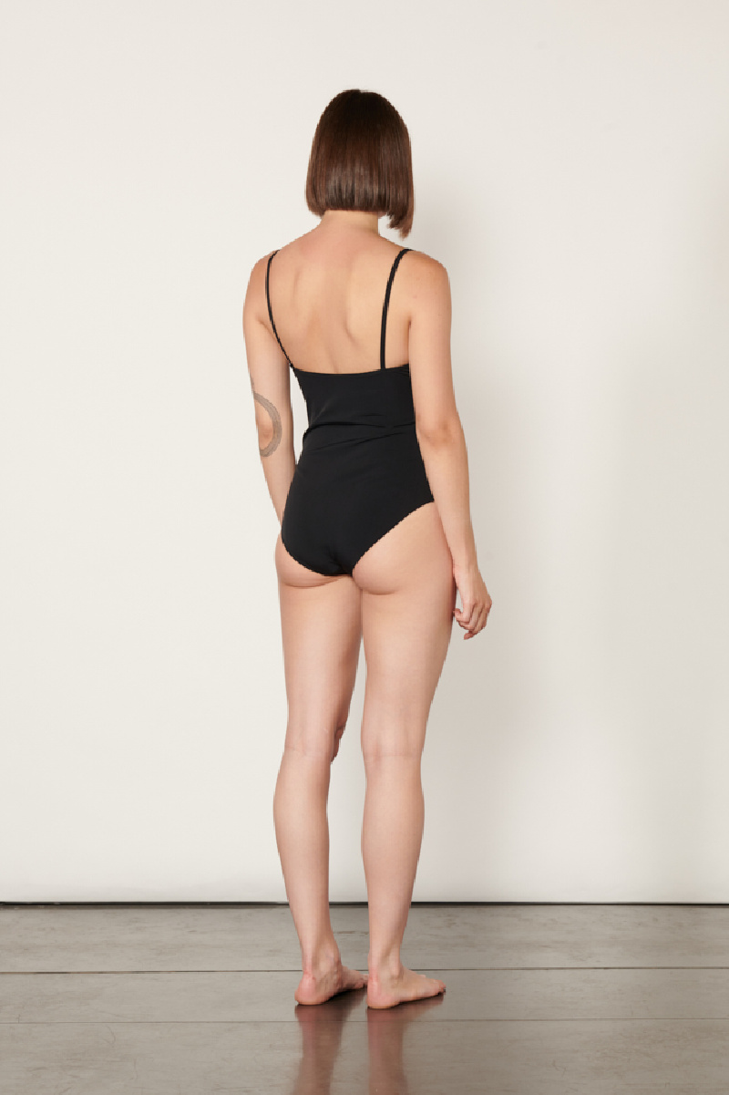 Black Salacia Ruched swimsuit from Christopher Esber adds a sculptural touch to beachwear elegance.