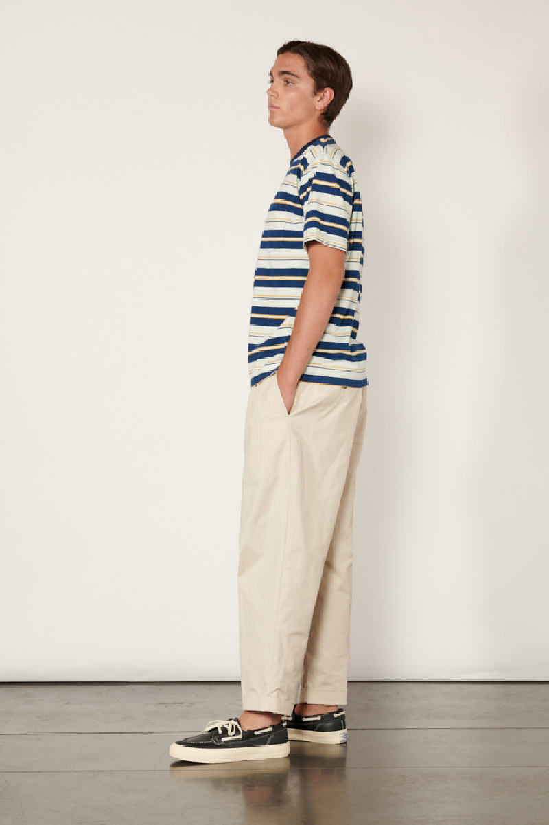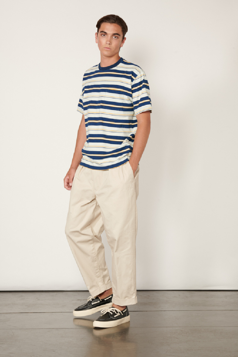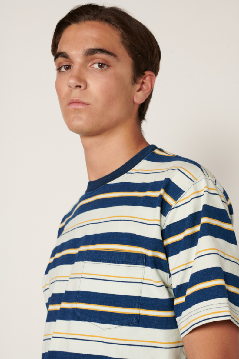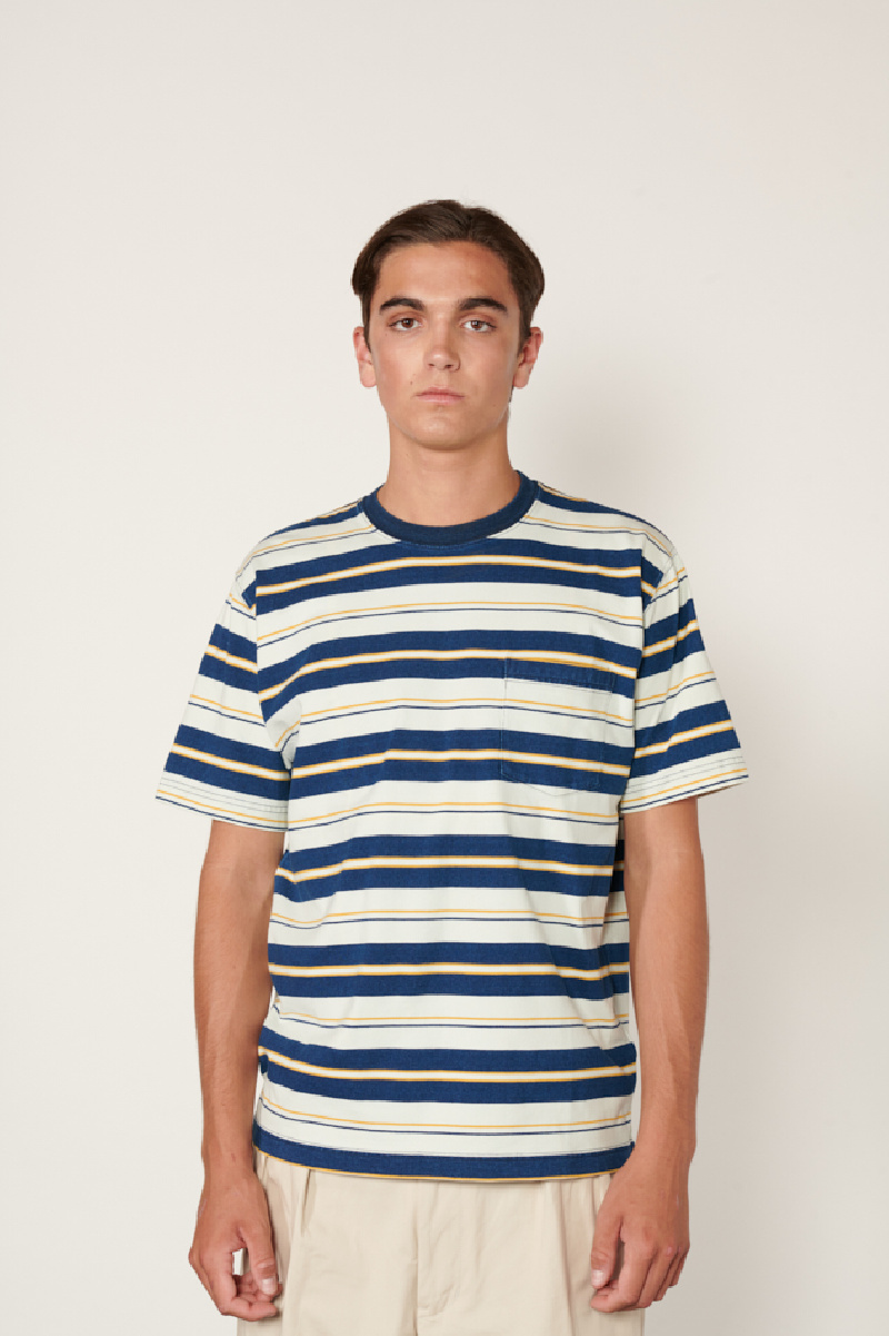 Semi-thick cotton t-shirt with blue, yellow and beige stripes, from the brand Beams +.