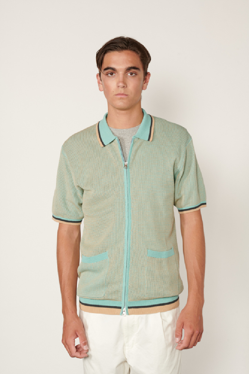 Zipped knit polo shirt in a cotton and ramie blend, predominantly blue and beige, from Beams +.