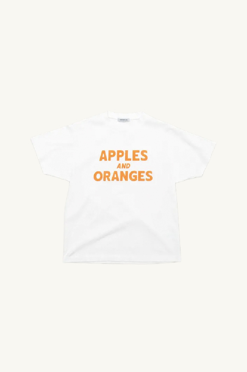 It offers a classic cut bearing the inscription "oranges and apples", with a crew neck collar.