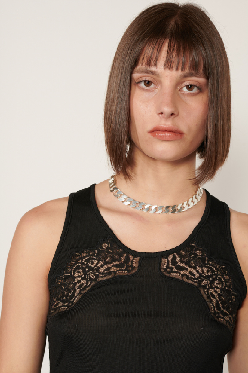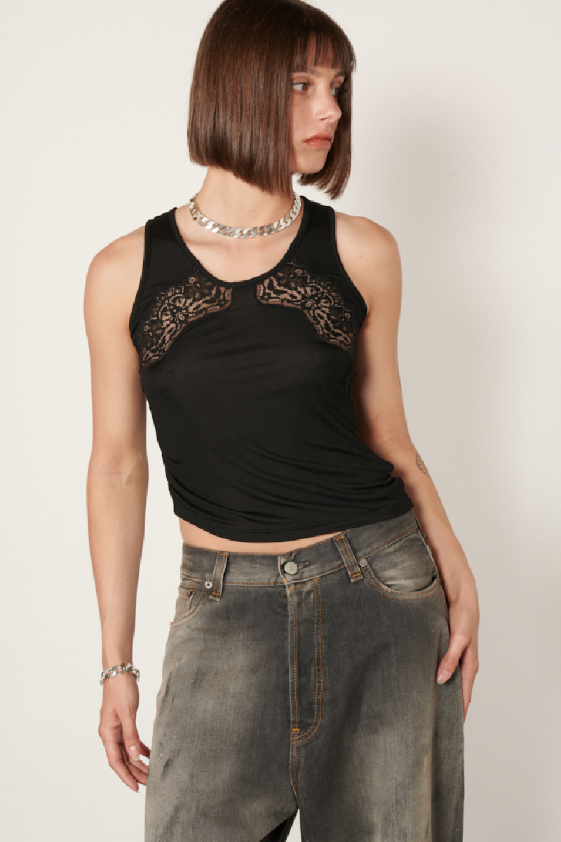 Lace tank top with a fitted silhouette marries comfort and sophistication, in black, from the Christopher Esber brand.