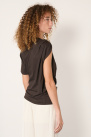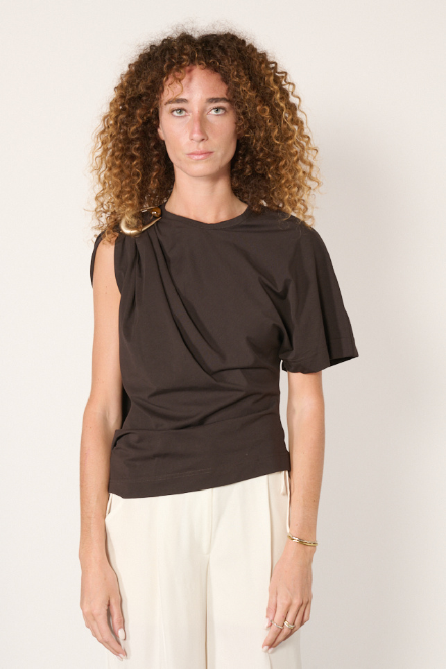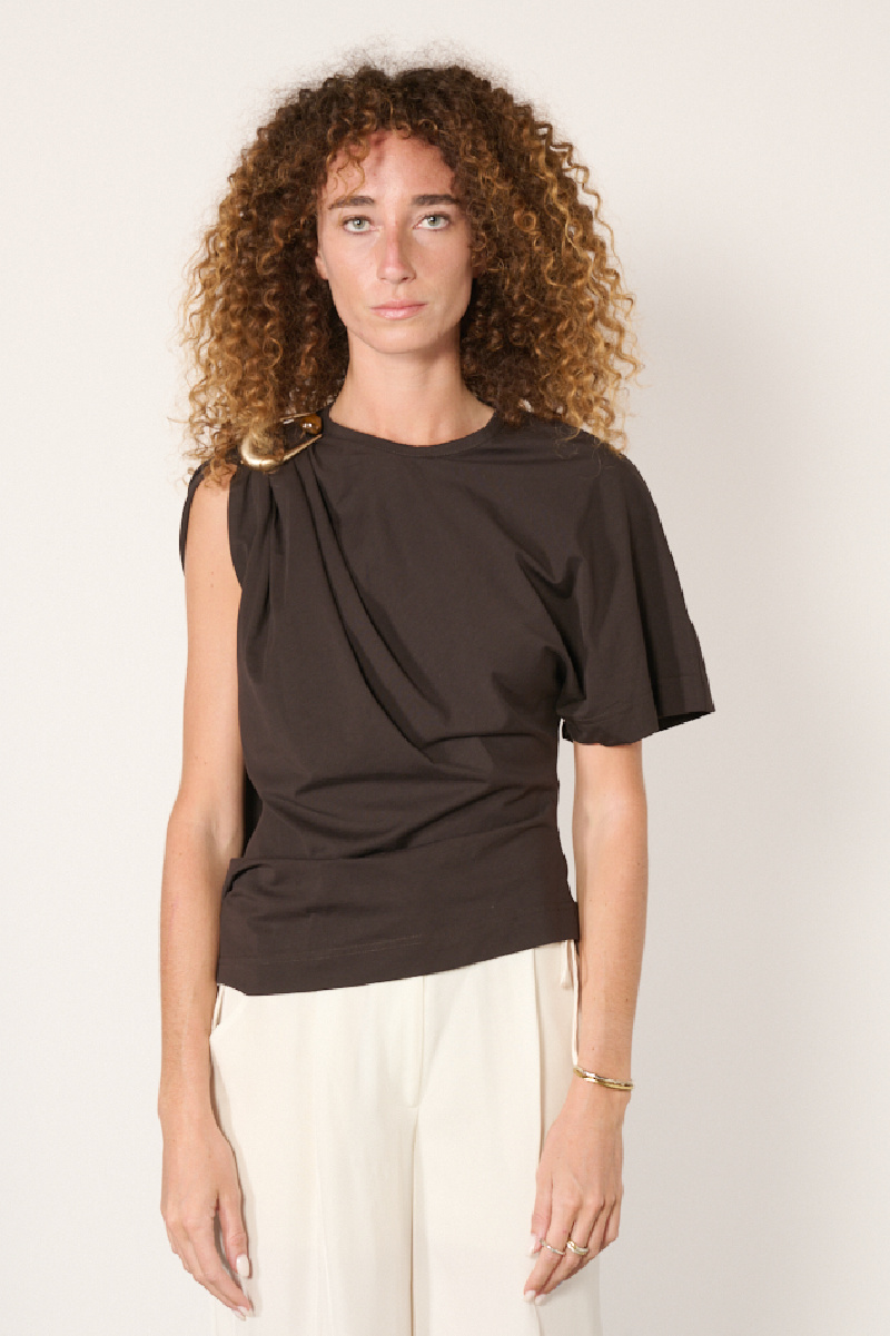 Designed with a fitted and deconstructed silhouette, this piece features an asymmetric sleeve with a gathered shoulder, secured by a brushed gold-tone metal ring adorned with a natural brown stone.