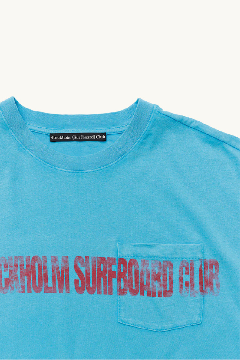 It features a boxy, waist-length cut, a crew neck, a chest pocket, and the red “Stockholm Surfboard Club” print across the front and pocket.