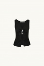 It is designed with a fitted silhouette, a slightly asymmetric, sleeveless cut, and a V-neckline.