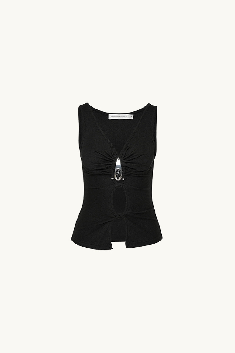 Crystal Pendant Open Twist top in fine black ribbed jersey by Christopher Esber.