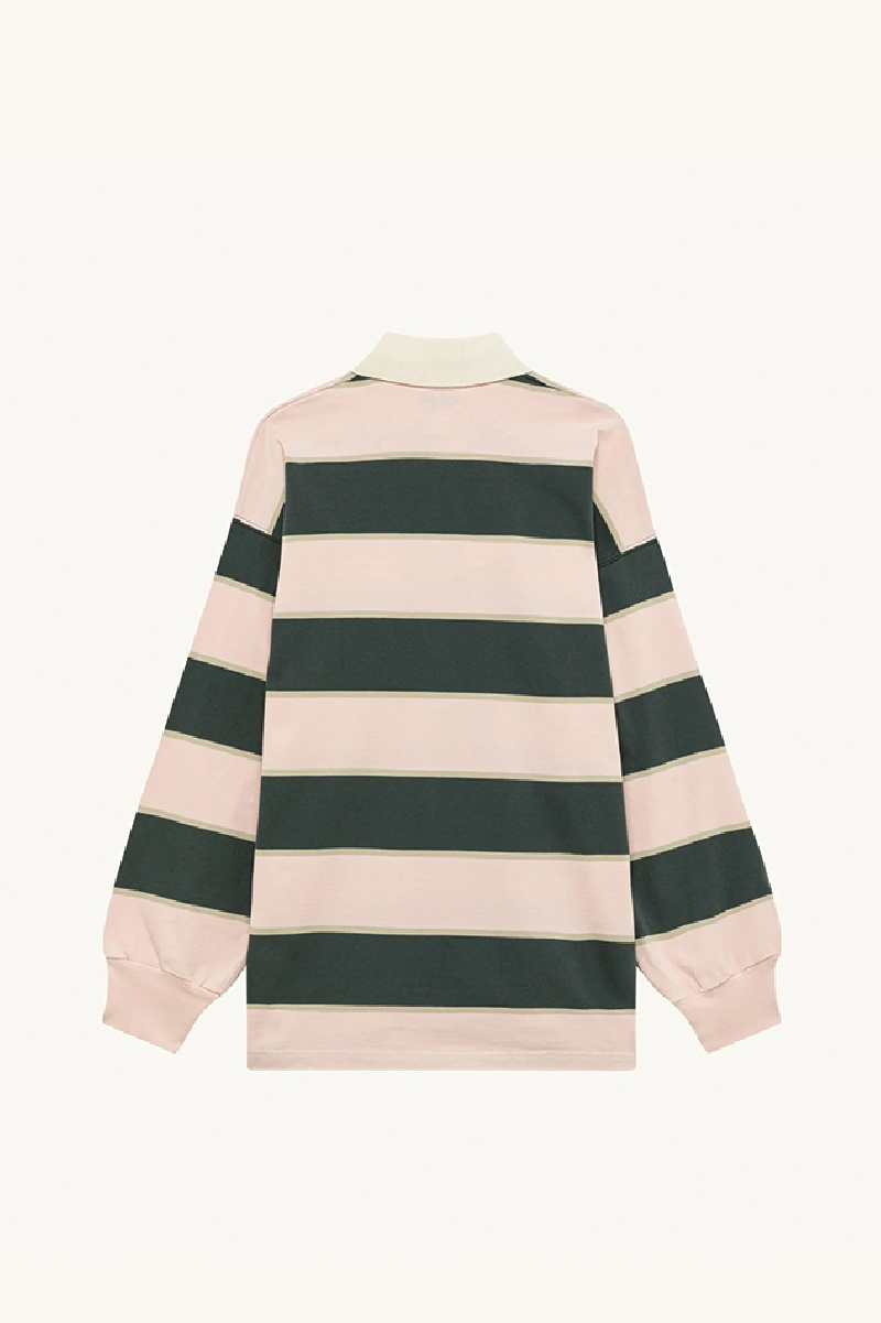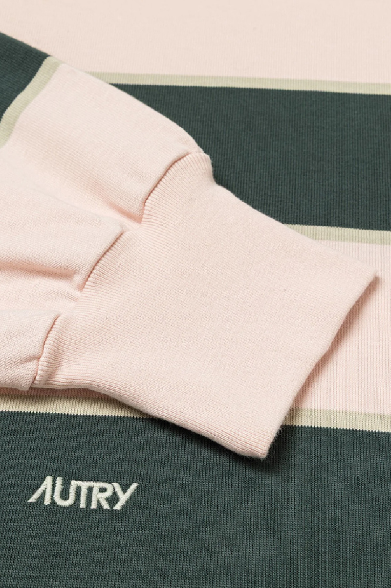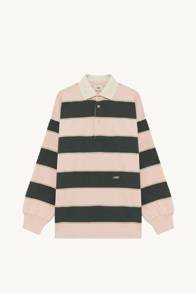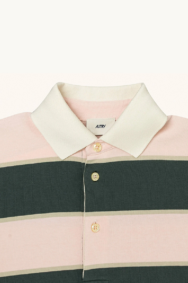 Long-sleeve cotton polo in pine green and pale pink by Autry.