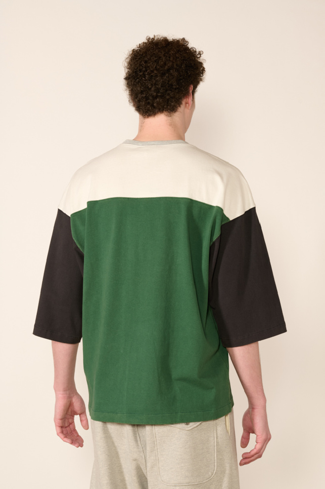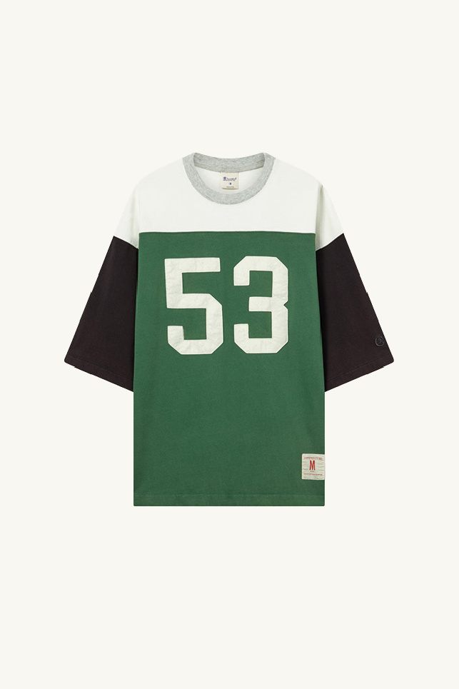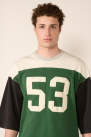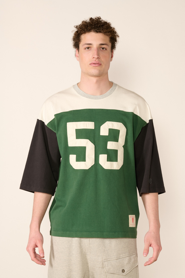 Inspired by 1970s American football, it features a relaxed fit, 3/4 sleeves, a digital graphic on the chest, and brand logos on the hem and sleeve.