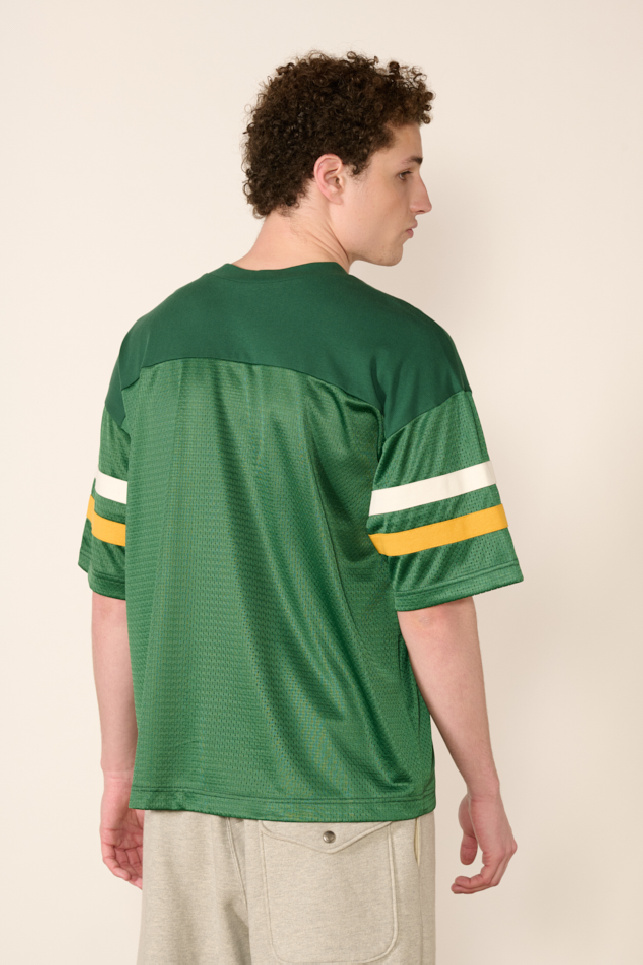 An iconic piece of revisited archive sportswear, its design features short sleeves, a V-neck, contrasting stripes on the sleeves, a digital graphic on the chest, and brand logos on the hem and sleeve.