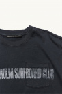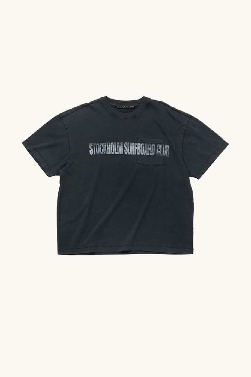 It features a boxy, waist-length cut, a crew neck, a chest pocket, and the “Stockholm Surfboard Club” print across the front and pocket.