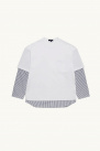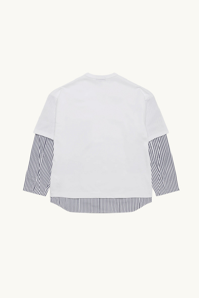 Its design plays with a layered effect, with striped panels at the sleeves and hem, evoking the look of a shirt worn underneath the T-shirt.
