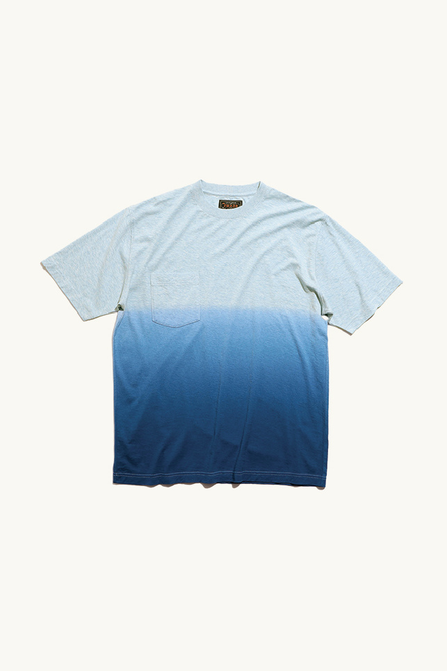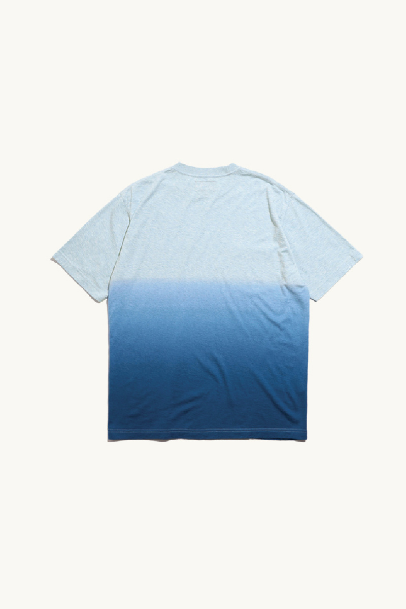 The piece stands out for its gradient dye, transitioning from a lighter blue near the collar to a deeper blue towards the hem.