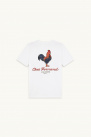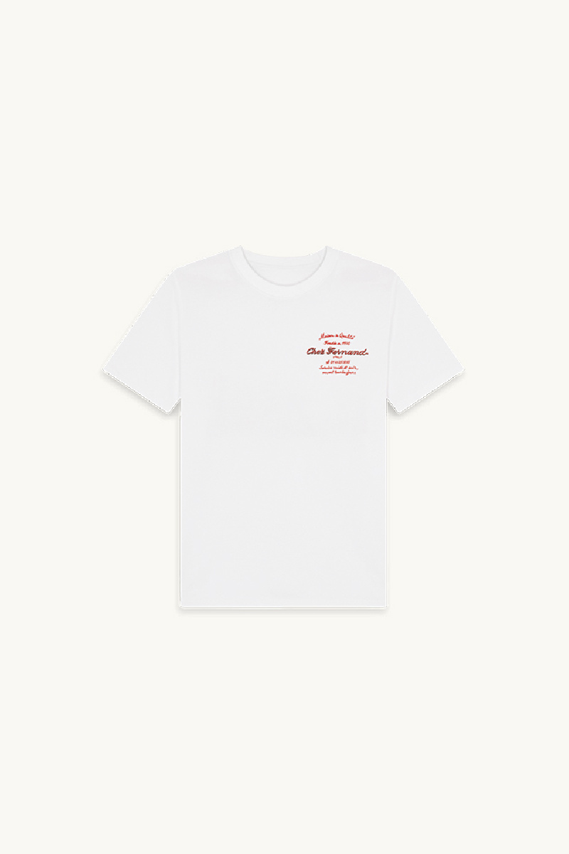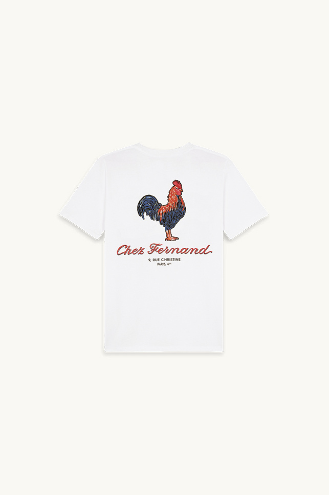 On the front, a red “Chez Fernand” embroidery is highlighted with a subtle black shadow, accompanied by finely embroidered details referencing the restaurant, while the back showcases a screen-printed design featuring the house’s iconic rooster.