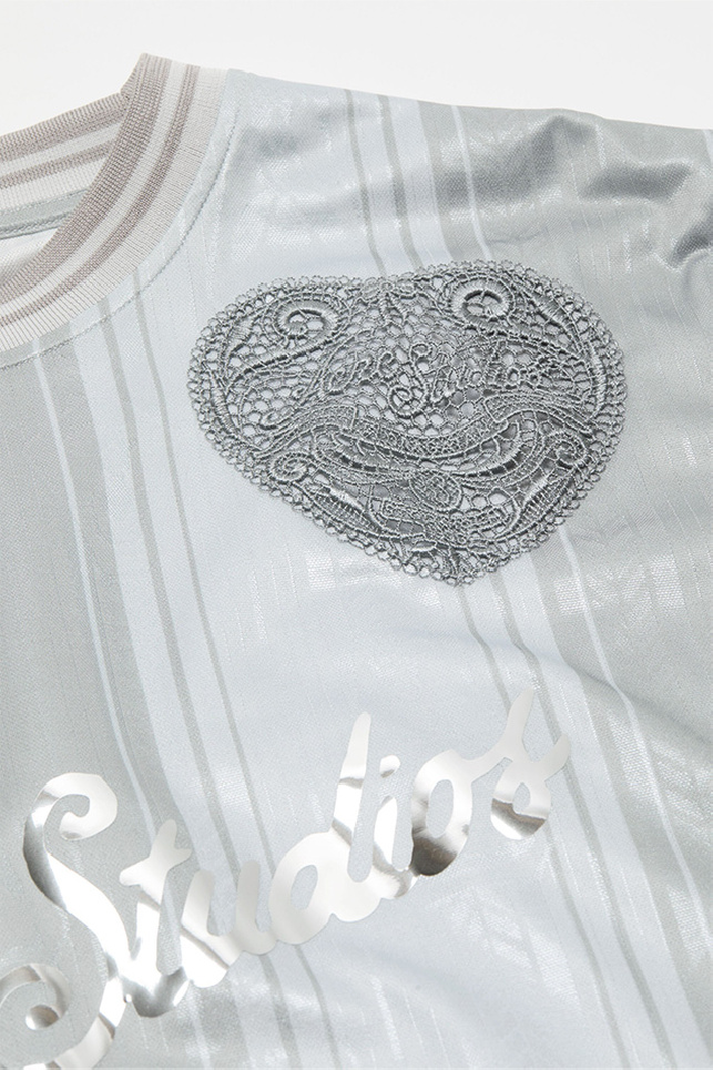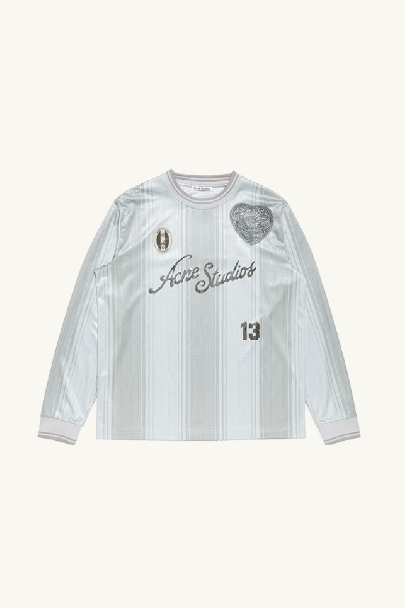 It has a relaxed fit inspired by sports jerseys, with a crew neck and ribbed cuffs.