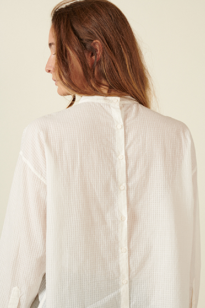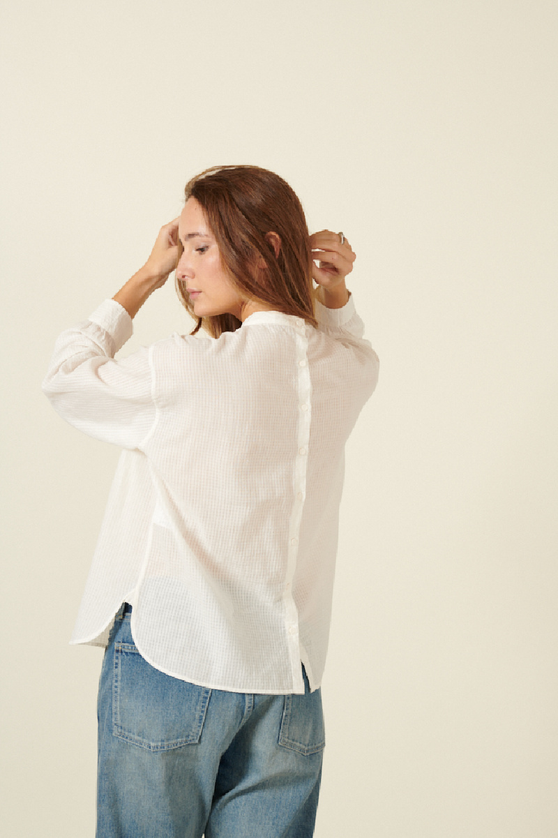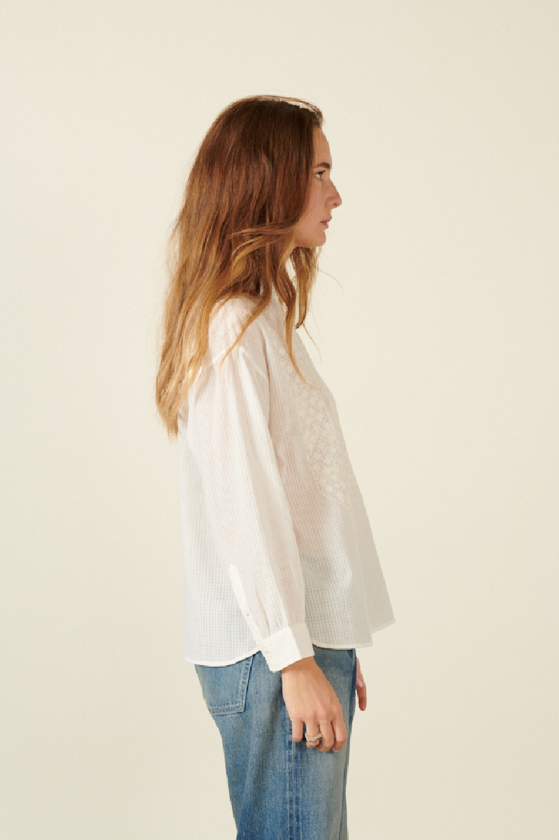 The blouse from Maison de Soile is available in white. Hand embroidered on the front and entirely made of organic cotton for a soft and light finish. Button closure in the back.
