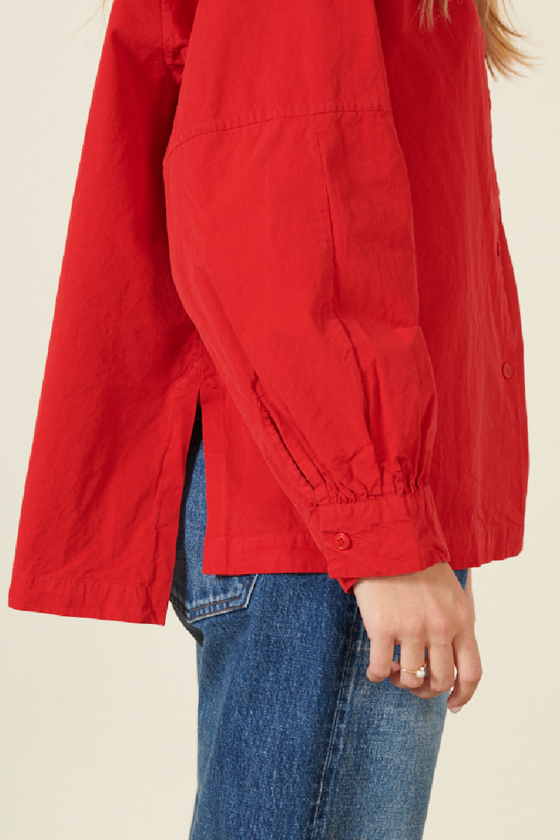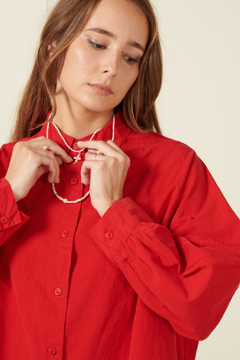 The red shirt Elena from the brand Casey Casey is characterized by its long puff sleeves, classic collar and slightly wide straight cut. It has a button fastening on the front, with side slits and an asymmetrical cut between the front and back.