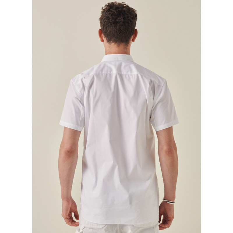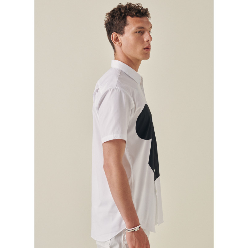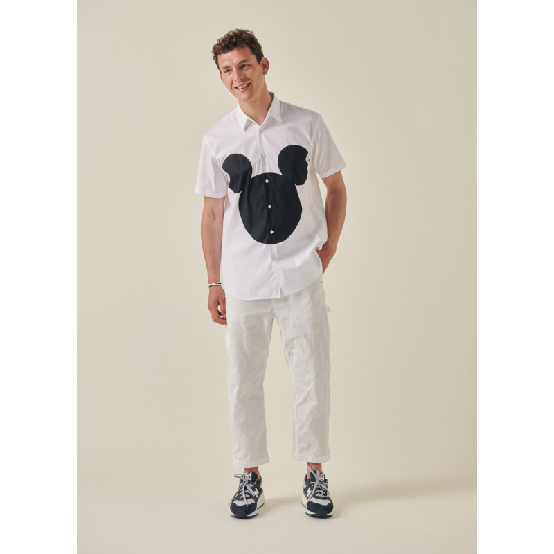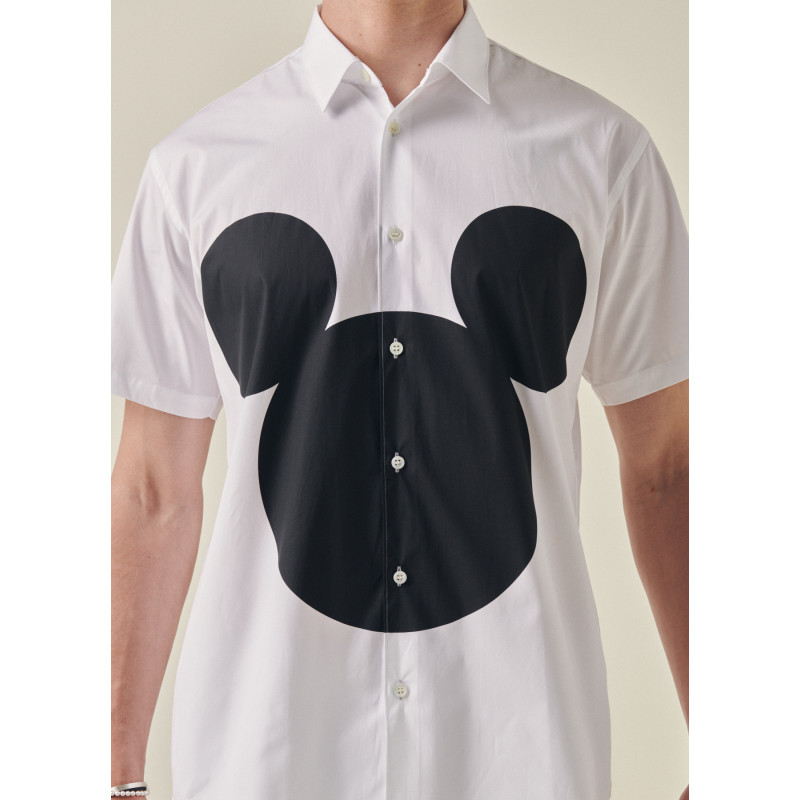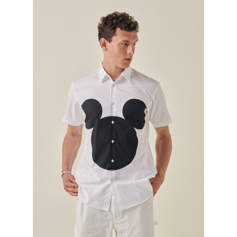 White Comme des Garçons Shirt, classic fit, curved hem, long sleeves, shirt collar, button closure, black mickey print on front.