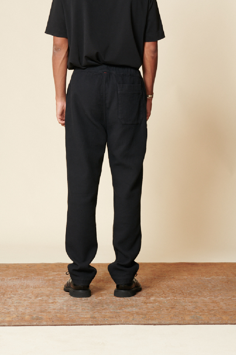 Ah Jog Pants Black from Casey Casey in washed cotton combines style and comfort with its straight and loose fit. They have an elasticated waistband that can be adjusted with a concealed drawcord, three pockets including two at the front, and a button fastening. The full lining ensures a comfortable fit.