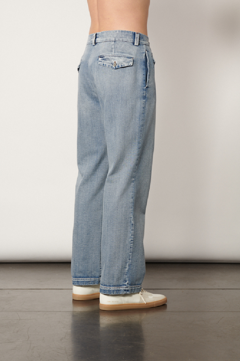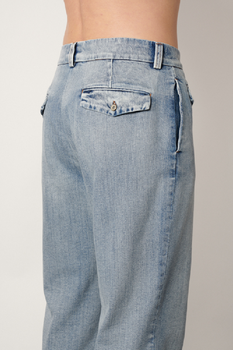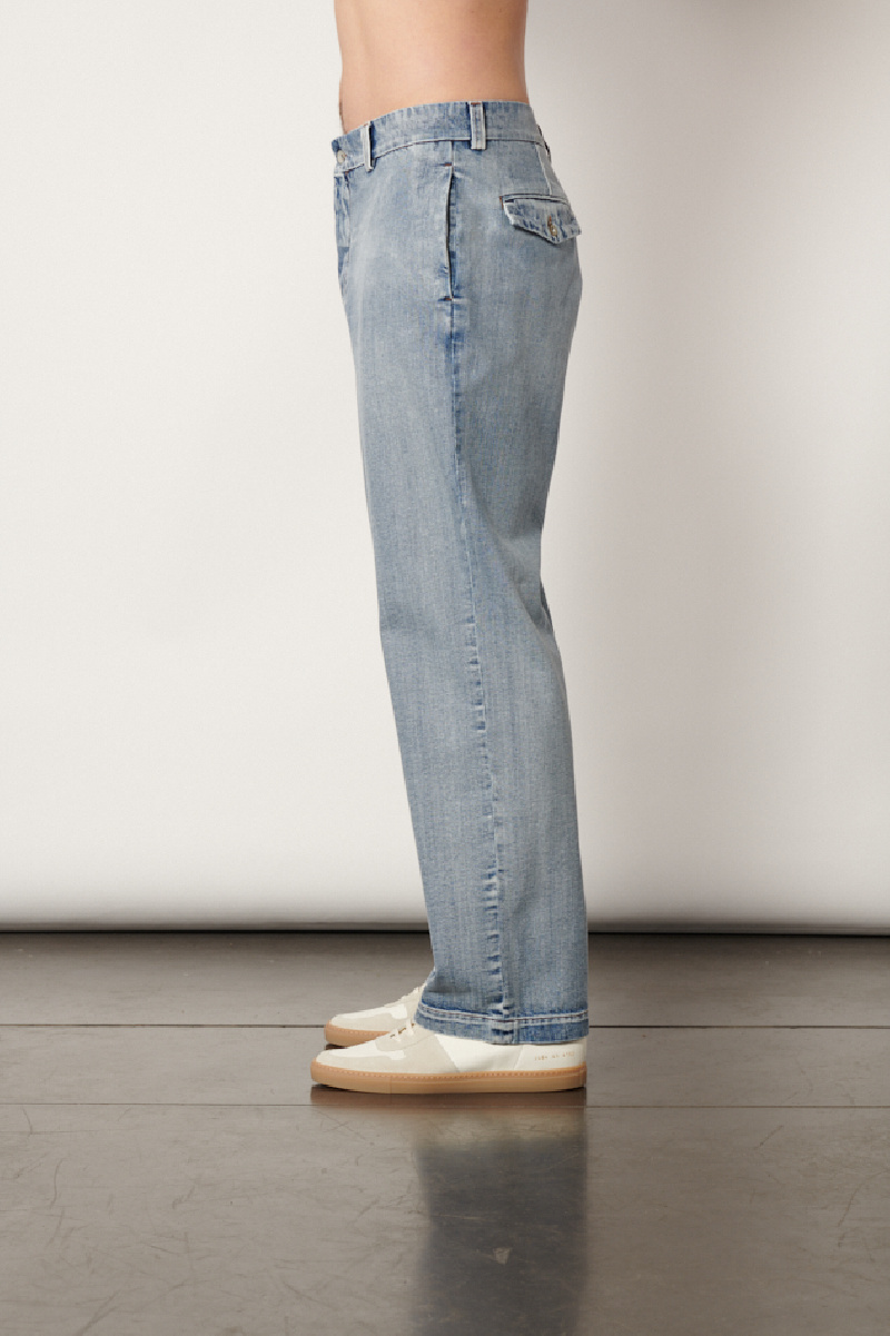 These Artuso pants in bleached denim fabric in mirage color, delicately hand-brushed, embody Barena's artisanal excellence, bringing a unique touch to the aesthetic of these pants. Its classic chino silhouette is enhanced by a flap-and-button utility pocket on the front, and on the back, for a practical and stylish touch.