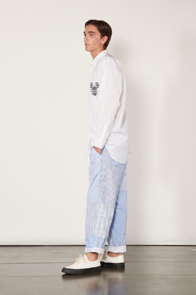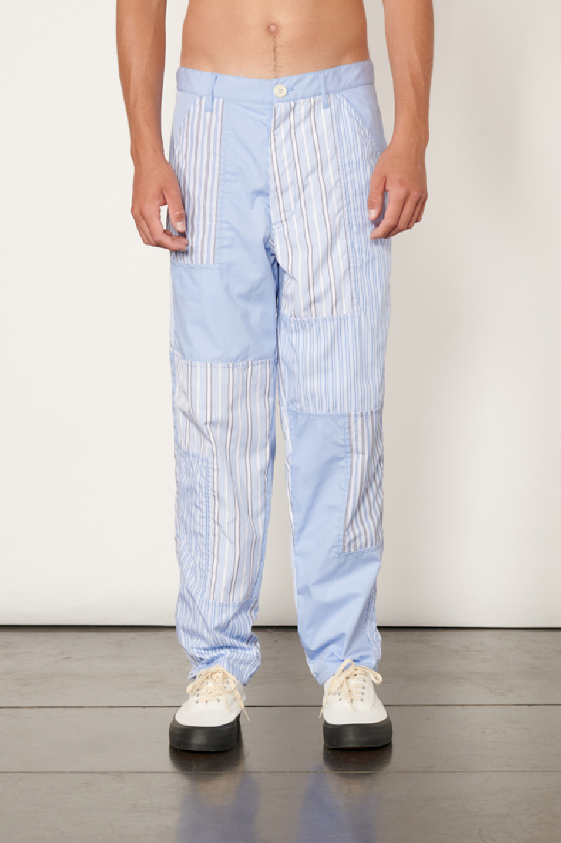 Blue cotton pants with striped patchwork from Comme des Garçons Shirt.