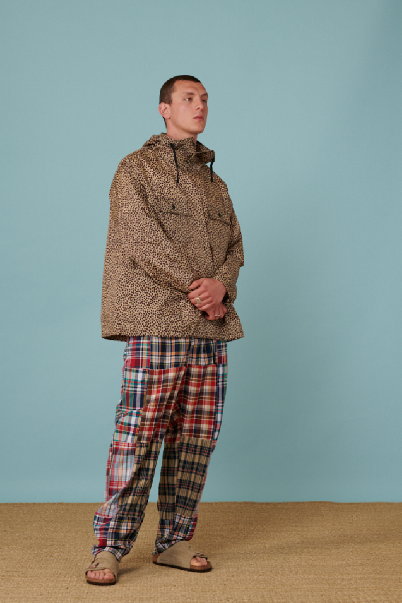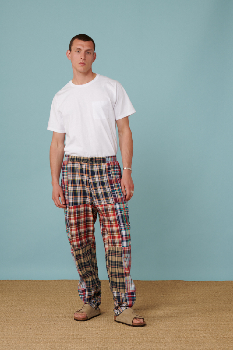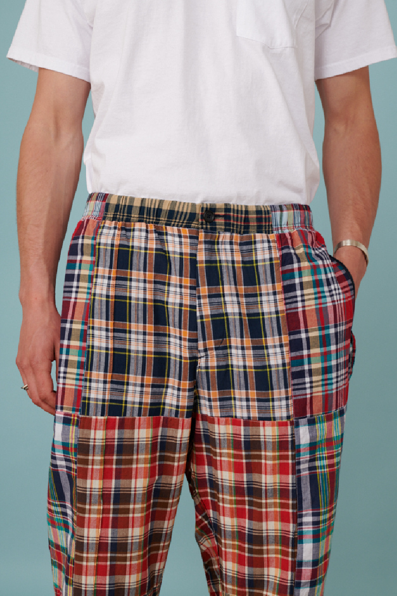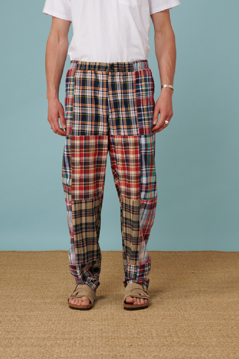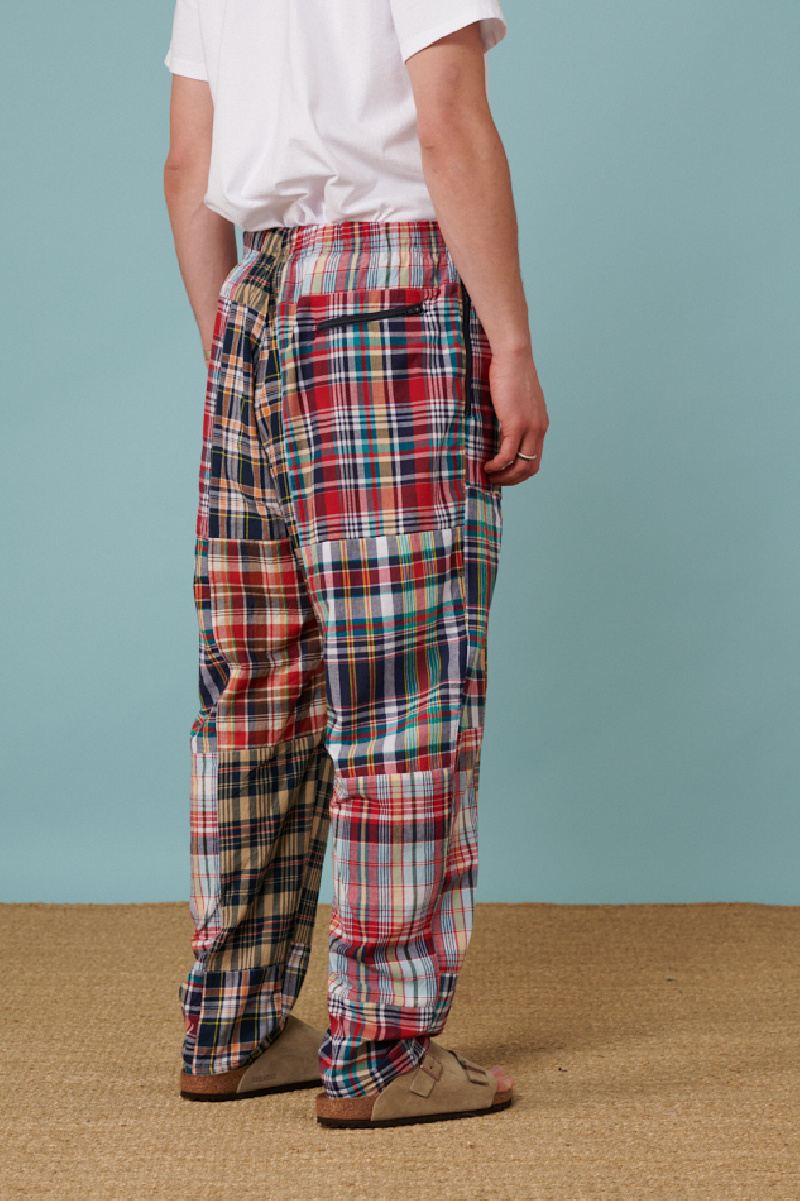 Patchwork madras slim jogging trousers in navy and multicoloured checks, from Engineered Garments. Patchwork assembly, side and back zip pockets. Straight cut, oversize.