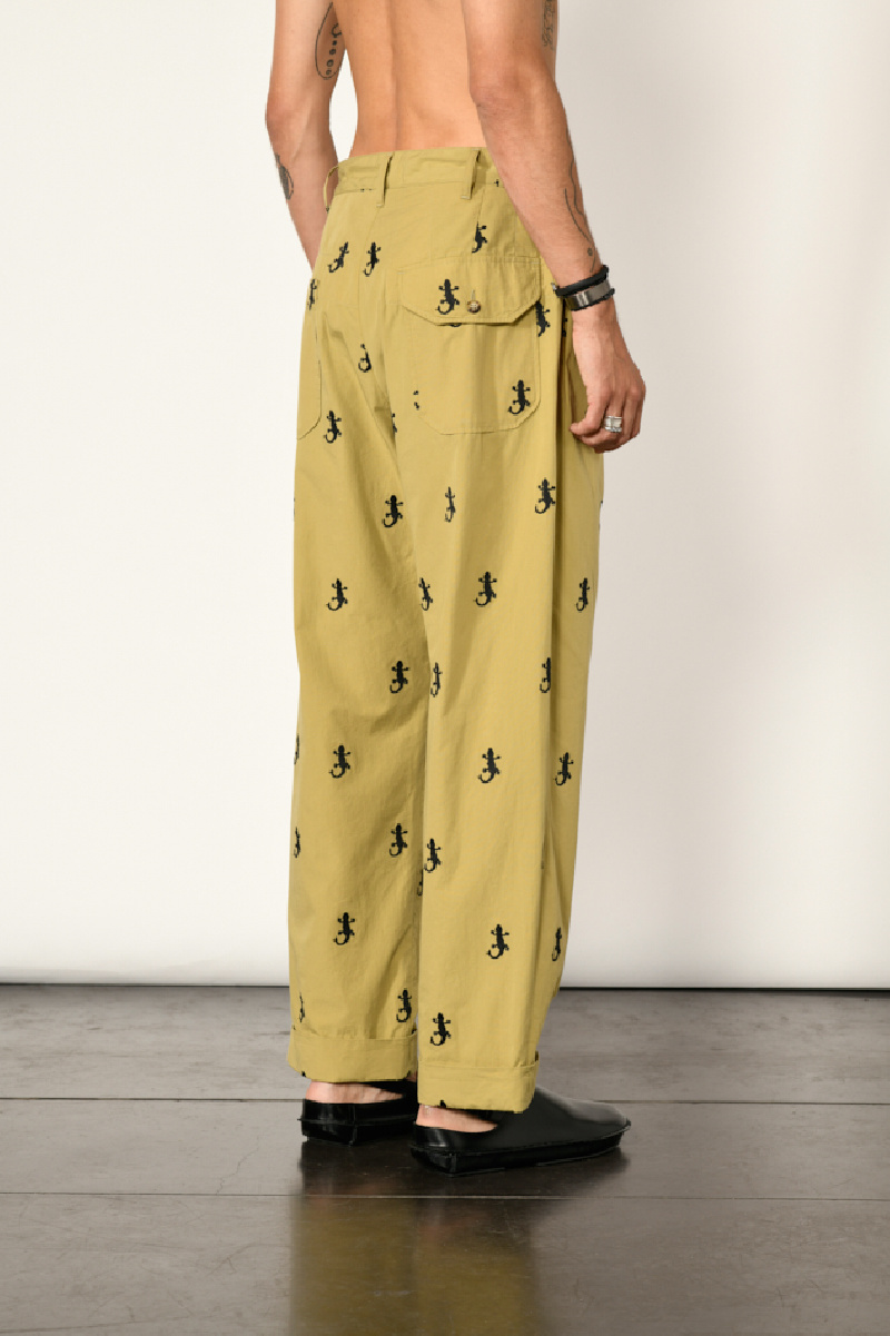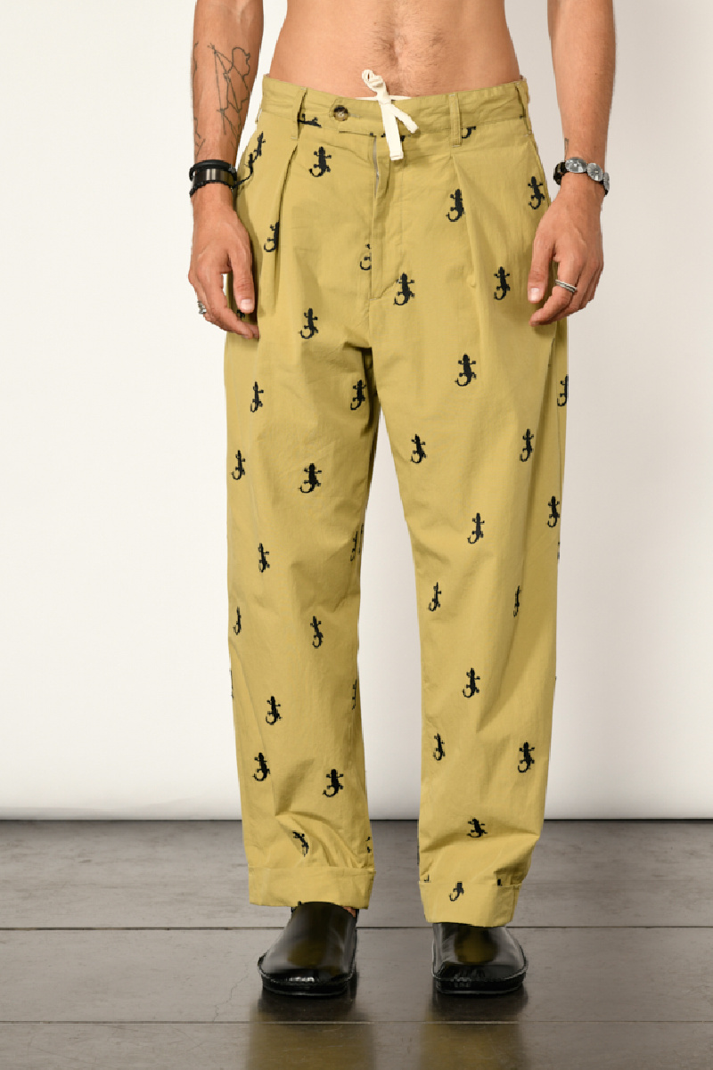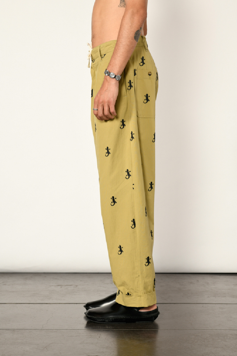 Pleated trousers in khaki cotton blend with embroidered Gecko patterns, from the brand Engineered Garments.