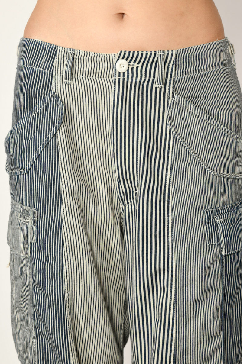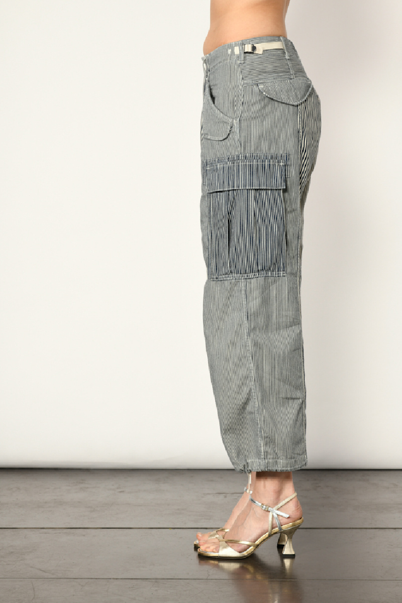 Denim cotton Cargo trousers with navy blue and white stripes, by R13.
