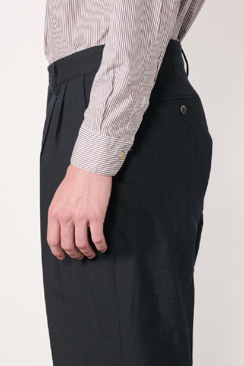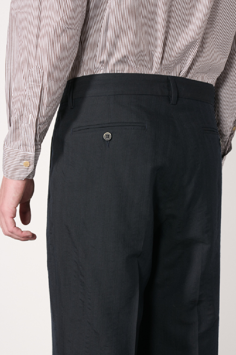 They feature a straight cut with pleats down the leg and turn-ups at the hem, a waistband with pleats and belt loops, side pockets, and two piped pockets with buttons at the back.