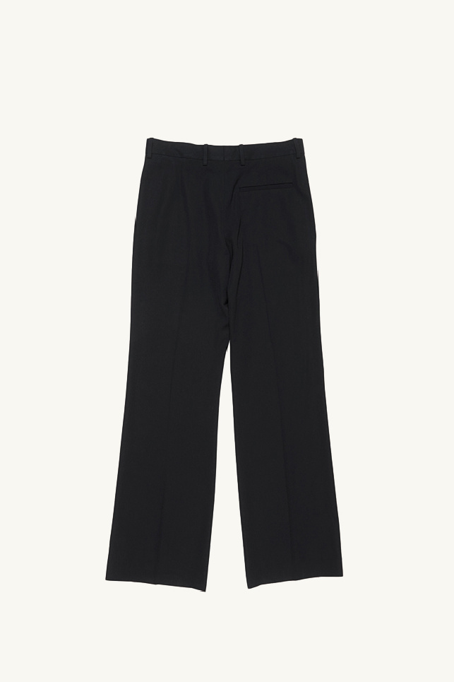 They feature a straight cut with a mid-rise waist and a slightly flared long leg, a fly with invisible hooks, discreet side pockets and a piped back pocket.