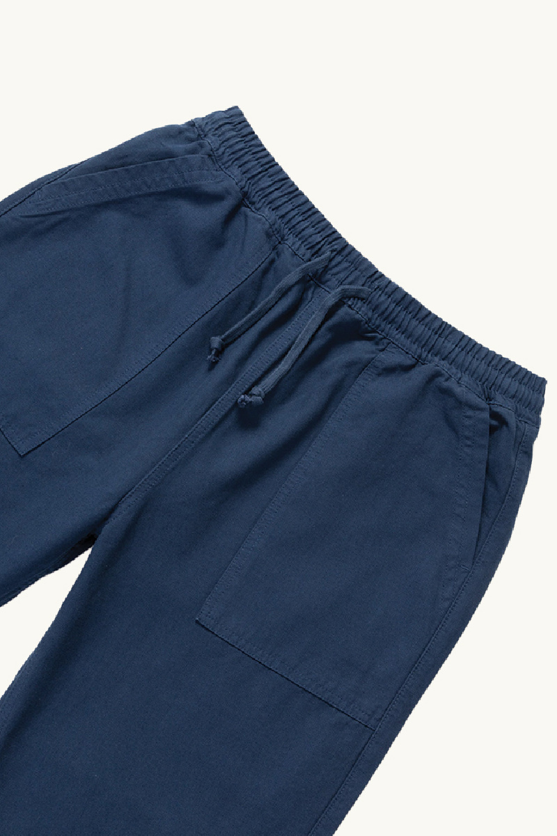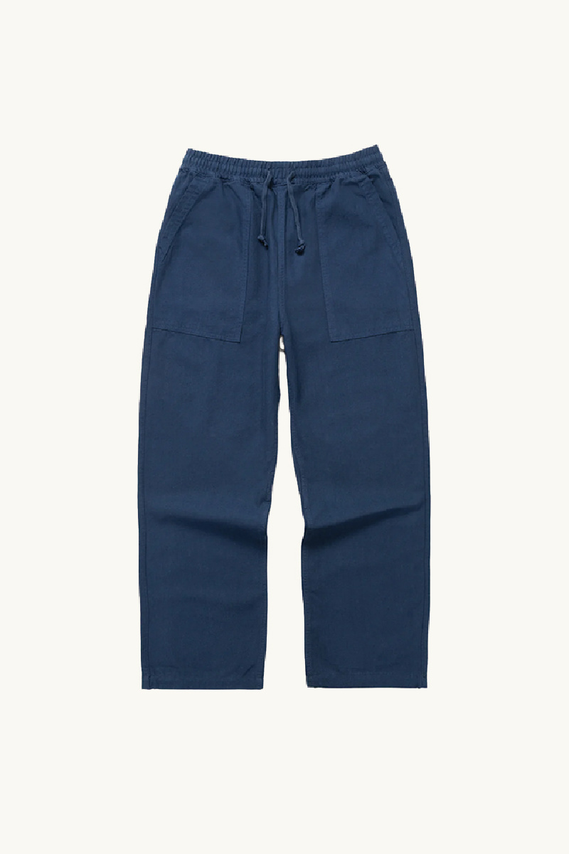 They feature a relaxed, straight fit, an adjustable waistband with drawstrings, fatigue-style front pockets, and a small yellow label with the brand logo on the right back pocket.